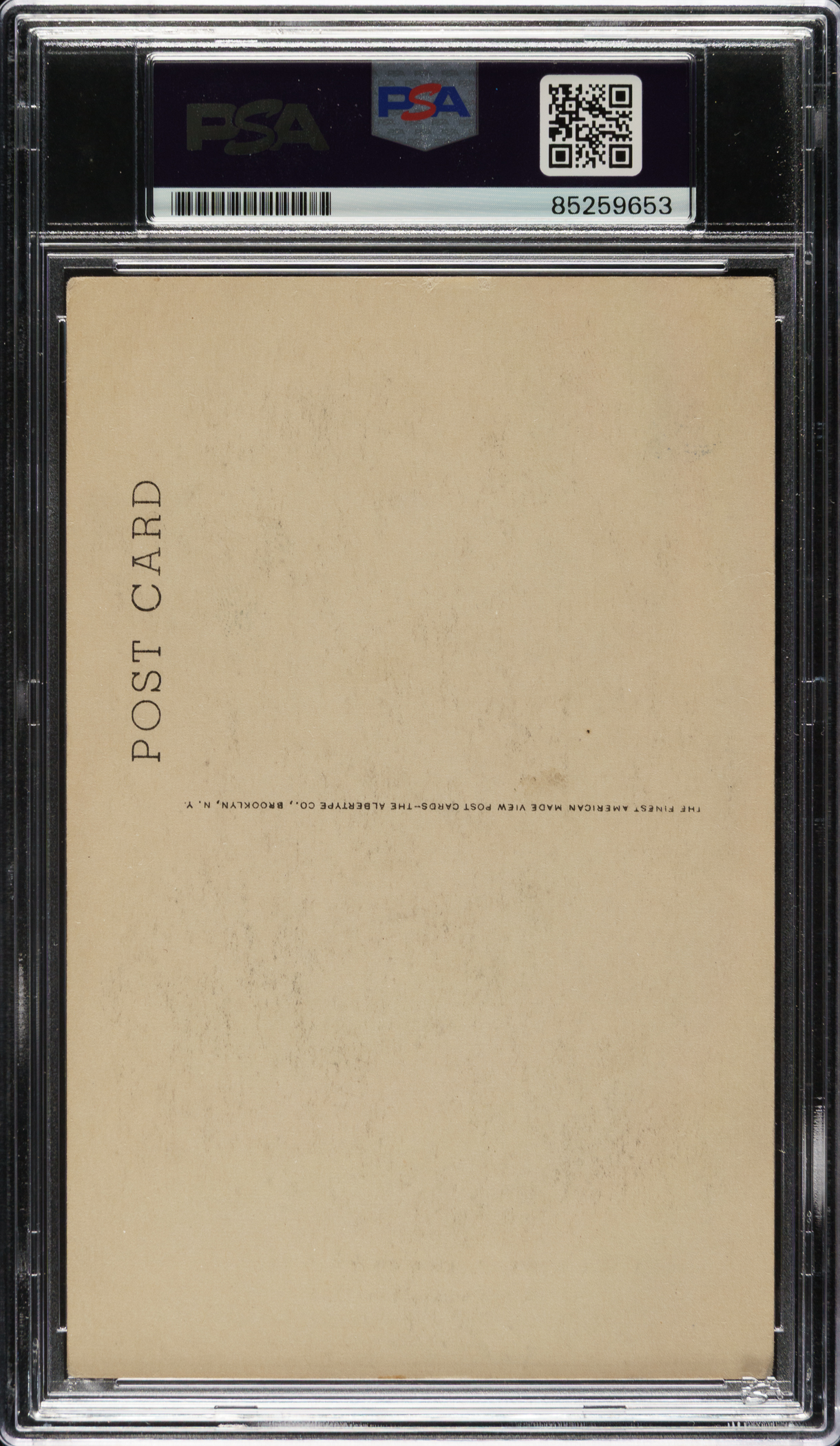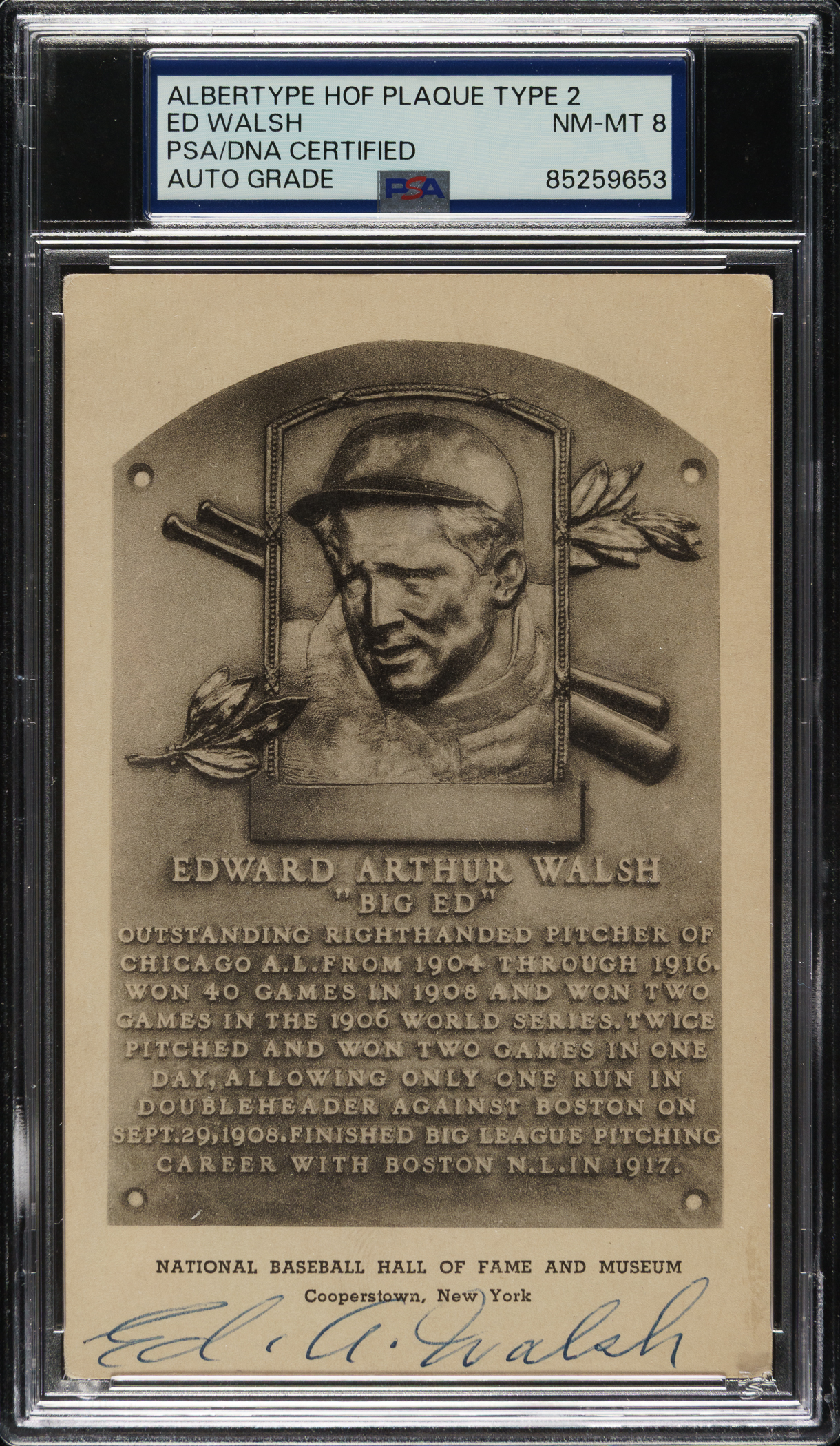 Black-and-white (Albertype, Type 2) Hall of Fame postcard of Ed Walsh signed by him in blue ink along the base. PSA/DNA has encapsulated the card and graded the signature NM-MT 8. Walsh was elected to the Hall of Fame in 1946 and passed away in 1959, resulting in the scarcity of his signed Hall of Fame postcards today. The postcard (3.5 x 5.5 inches) has even corner wear. In Very Good to Excellent condition overall.