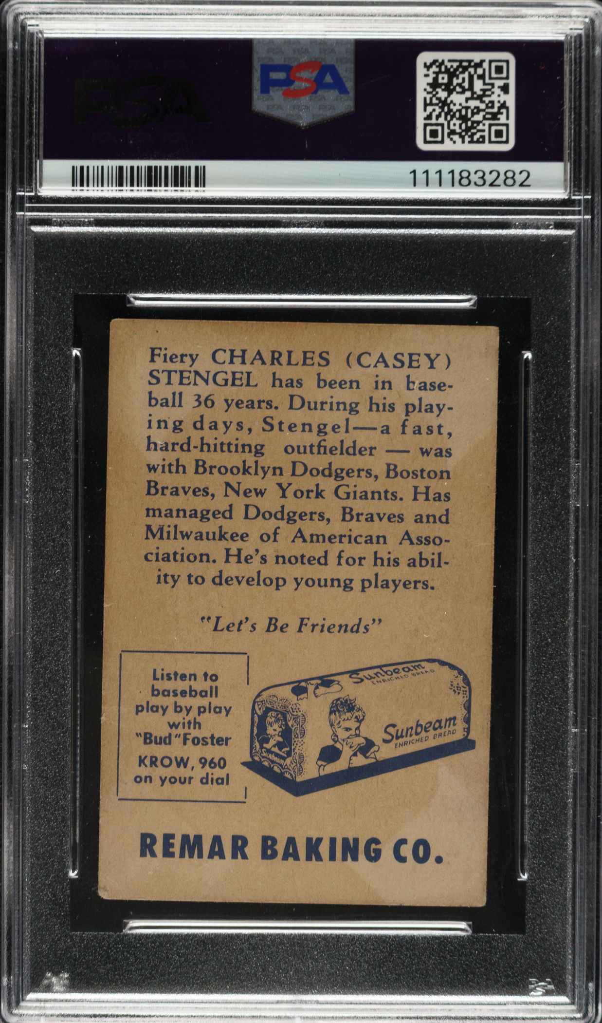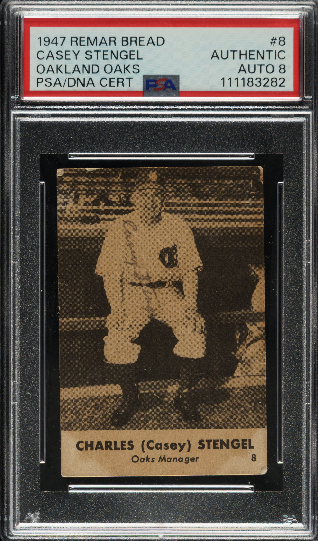 PSA/DNA has encapsulated the card, grading the signature NM-MT 8. Oakland Oaks Hall of Famer Casey Stengel. This is the ONLY example graded at this level by PSA with none higher!