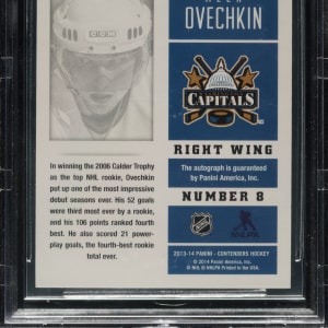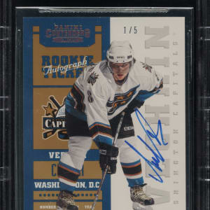 Stunning example of future Hall of Famer Alex Ovechkin's 2013-2014 Panini Contenders Rookie Ticket Recall Autograph Gold card. Limited in production out of five, the offered example is serial numbered 1/5 on the front. The offered example is graded GEM MINT 9.5 by BGS and bears a bold blue signature (graded GEM 10) across the front. This series design pays homage to the 1998 Contenders football set, which was released 15 years prior. The card's subgrades are 9.5 for centering, edges, and surface, and 9 for corners. A tremendous signed example featuring the greatest scorer in NHL history.