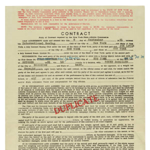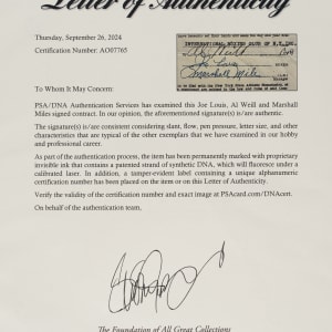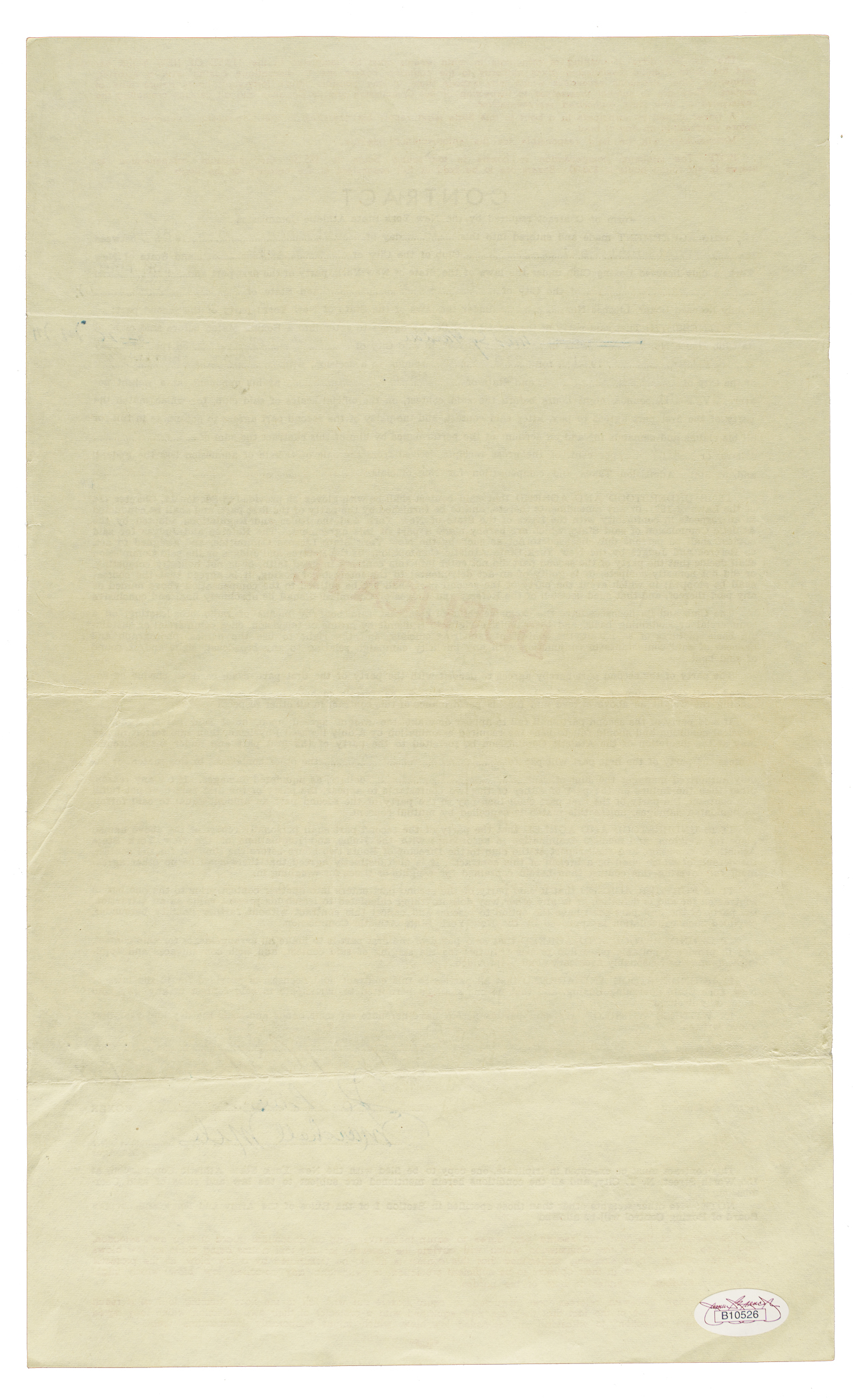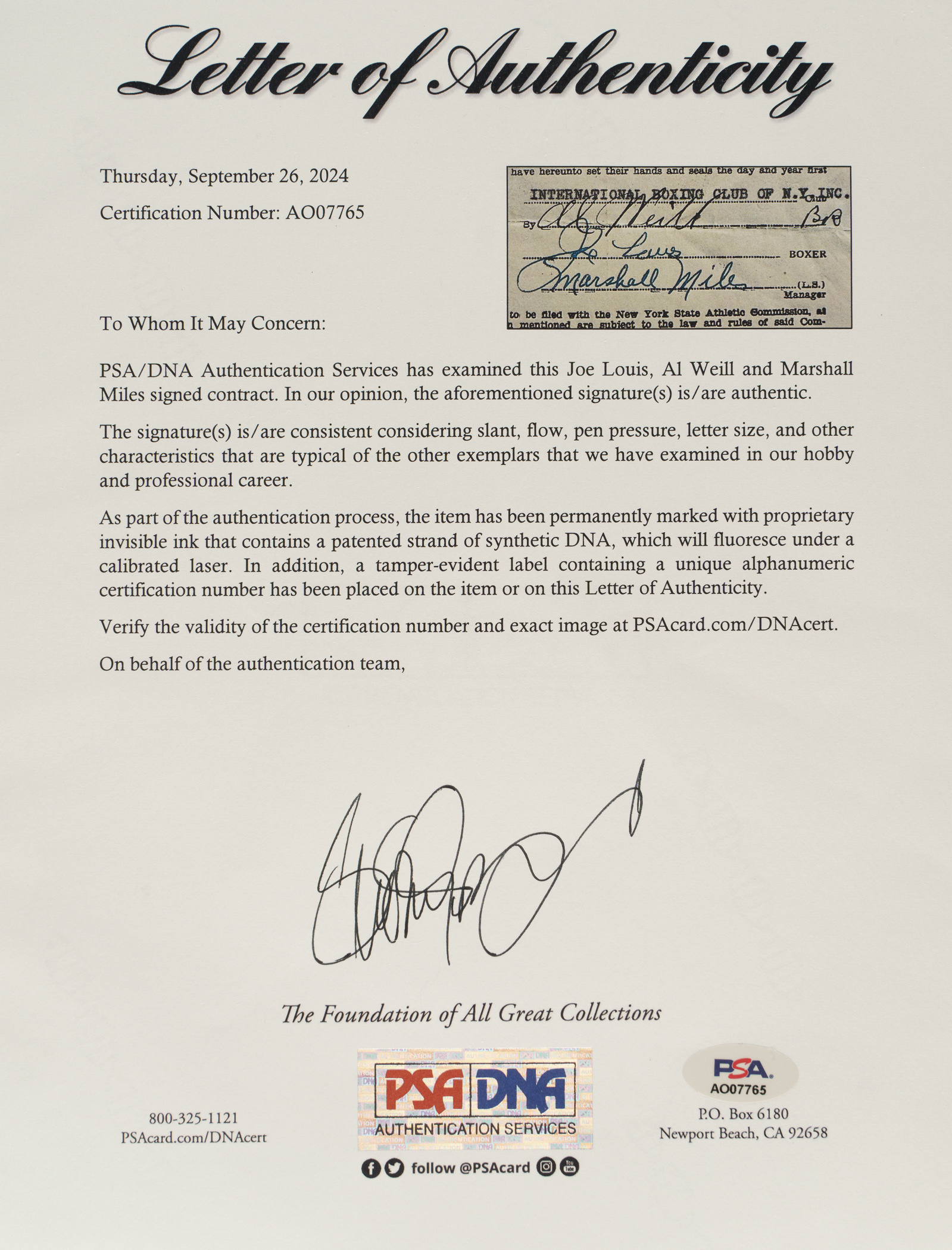 Extraordinary one-page typed fight contract, dated September 6, 1951, signed by former heavyweight boxing champion Joe Louis. This contract, between Joe Louis and Rocky Marciano, was for a heavyweight bout that was to be held at Madison Square Garden on October 26, 1951. It has been signed in blue fountain pen by "Joe Louis" along the base. The signatures of Marshall Miles (Joe Louis' manager) and Al Weill (Madison Square Garden executive/matchmaker) are scripted along the base as well. The aging Joe Louis was in financial distress when he agreed to fight the younger Rocky Marciano. Although he was an underdog, Marciano knocked out the "Brown Bomber" during the eighth round of the fight. In doing so, Marciano reluctantly ended Louis' legendary career. The contract (8.5 x 14 inches), which is stamped "Duplicate," displays three horizontal folds and is in Excellent condition overall. Full LOA from PSA/DNA. Please note a JSA authentication sticker is affixed to the reverse.