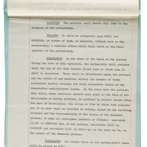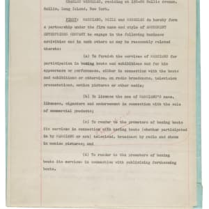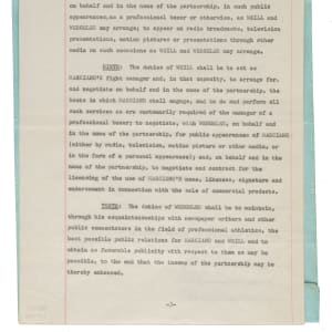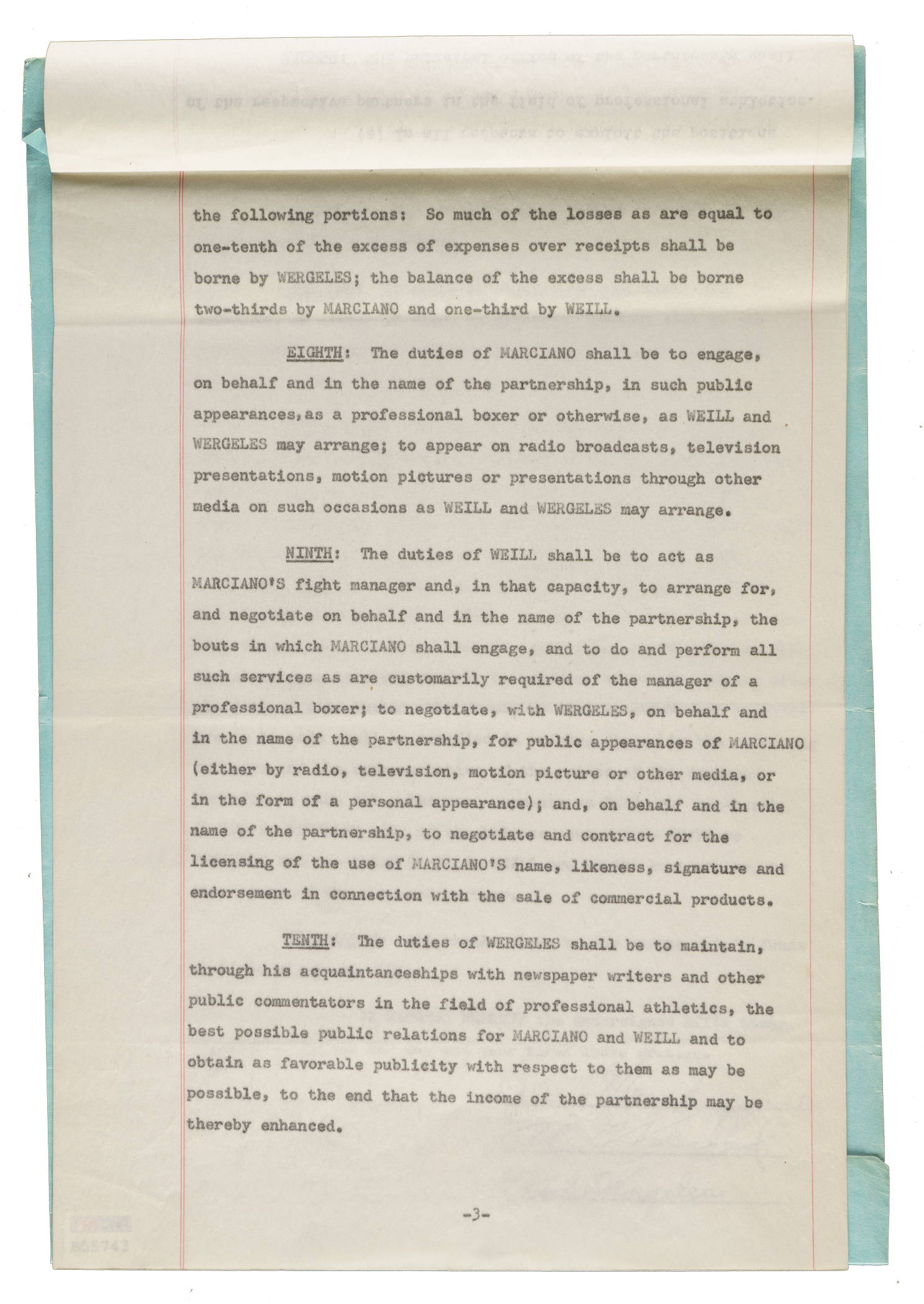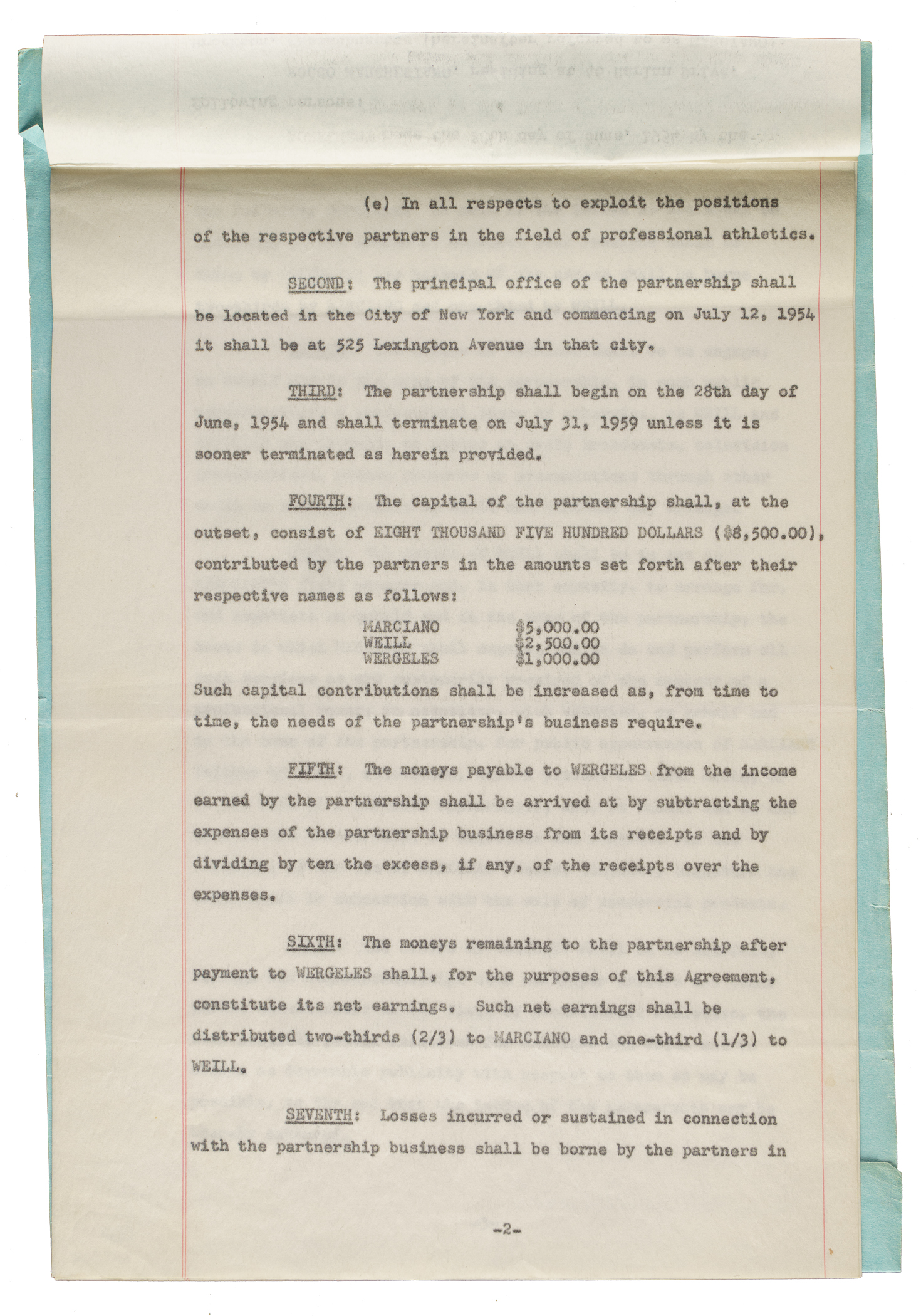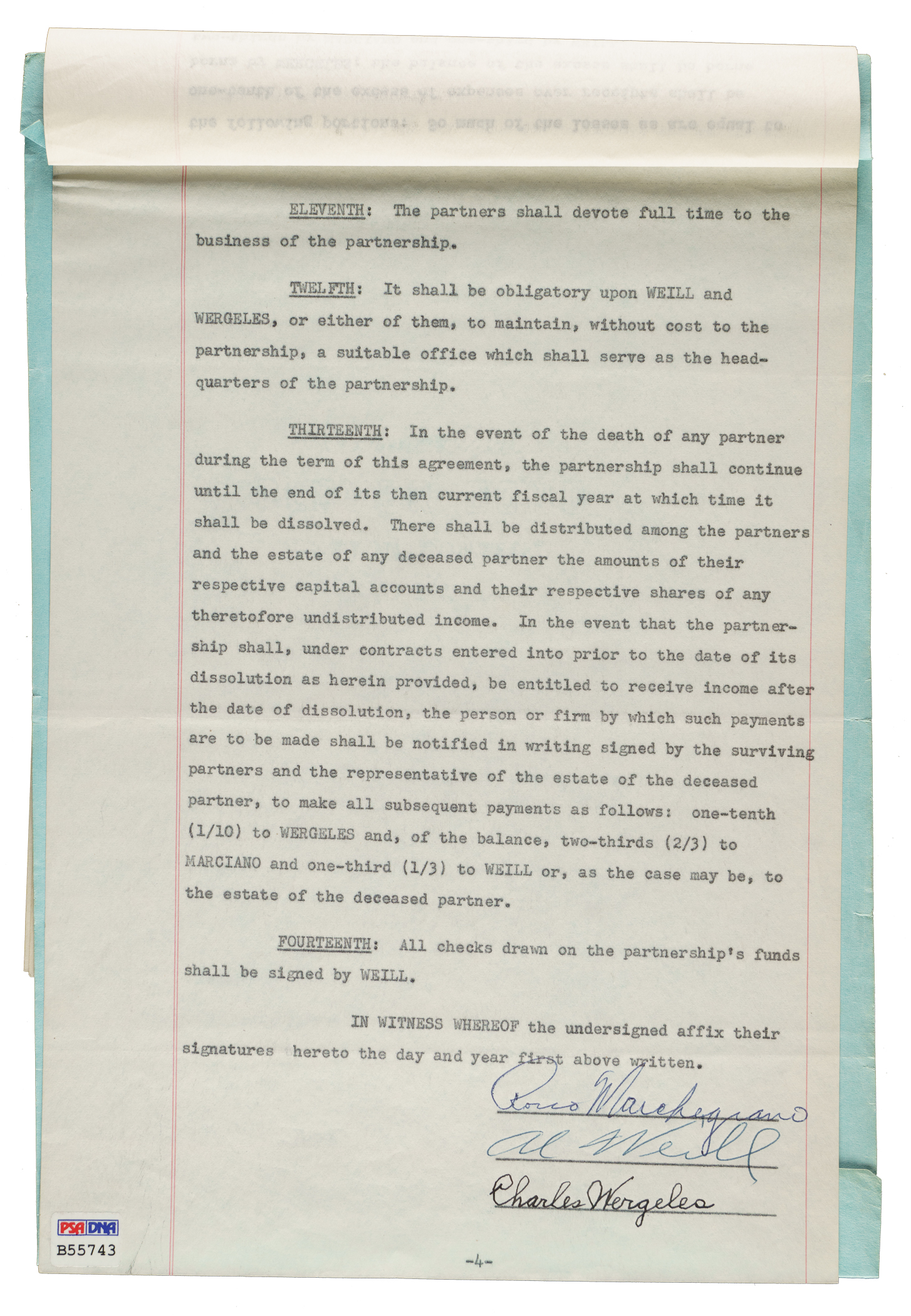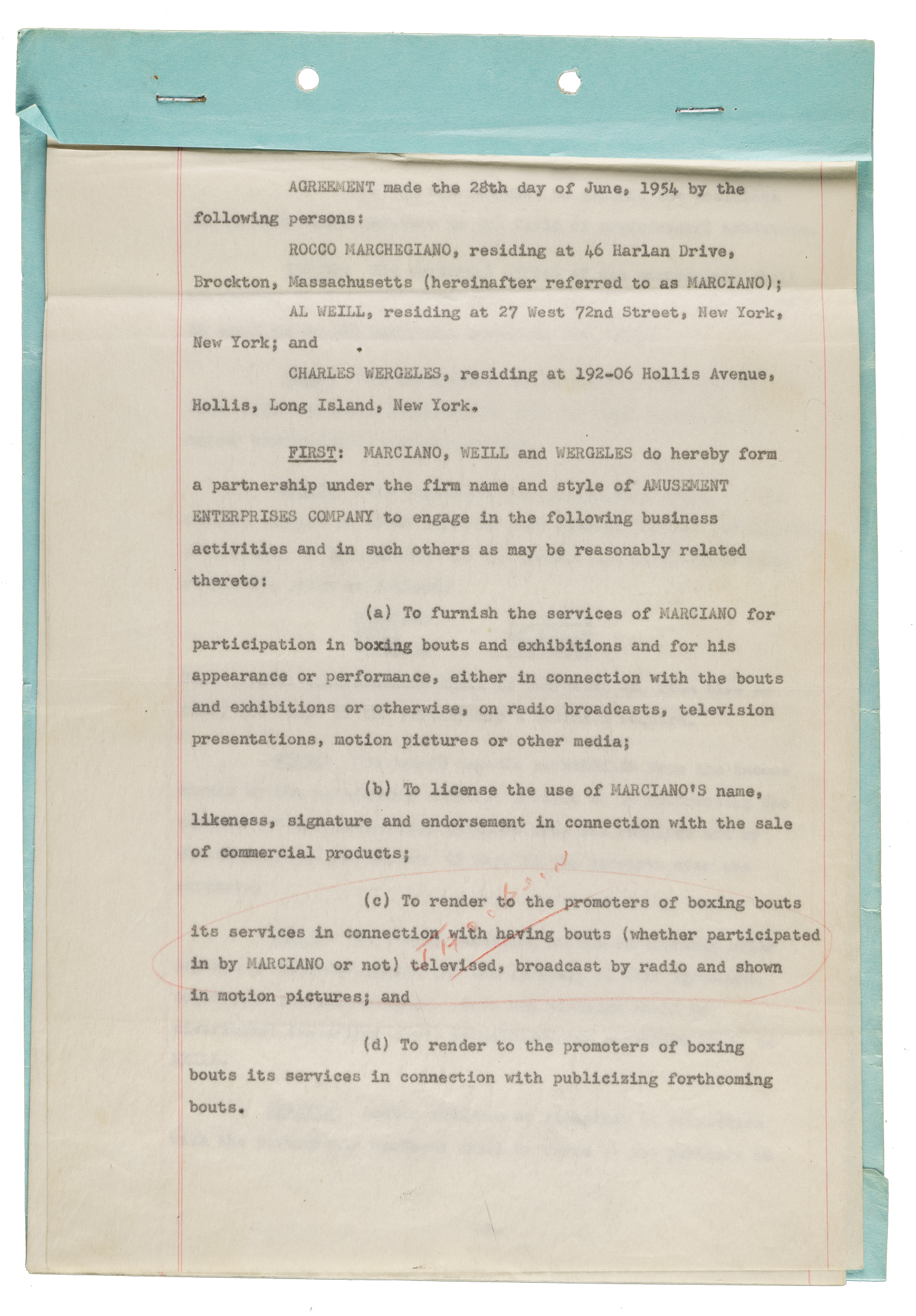 Four-page contract, dated June 28, 1954, between legendary heavyweight boxing champion Rocky Marciano and his two managers Al Weill and Charles Wergeles. The last page has been signed “Rocco Marchegiano” in blue ink along the base. (Rocco Marchegiano was Marciano's birth name.) Signed also by Al Weill (blue ink) and Charles Wergeles (black ink) directly below Marciano's signature. The typed document relates to the terms agreed upon by the three parties entering into the partnership to form the company "Amusement Enterprises." The contract (8.5 x 13 inches) displays three horizontal folds and is in Excellent to Mint condition. It is attached by means of two staples at the top to its original paper docket. A PSA/DNA certification sticker is affixed to the lower-left corner of the last page.