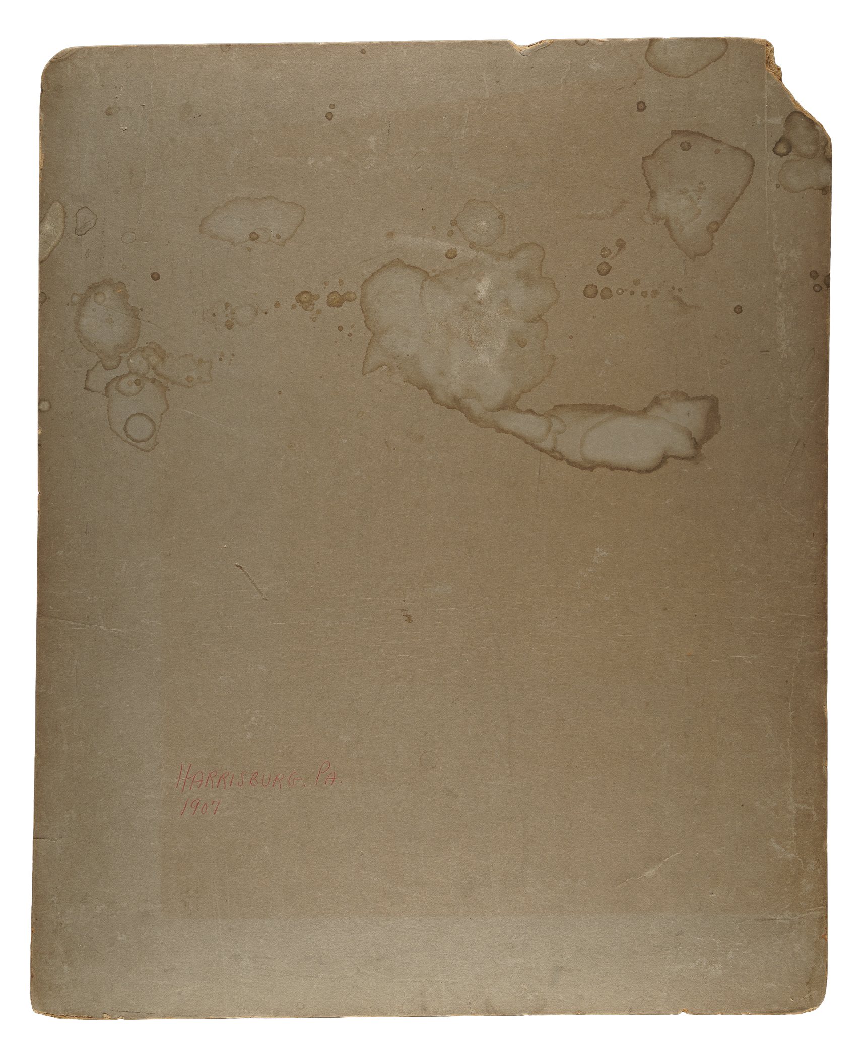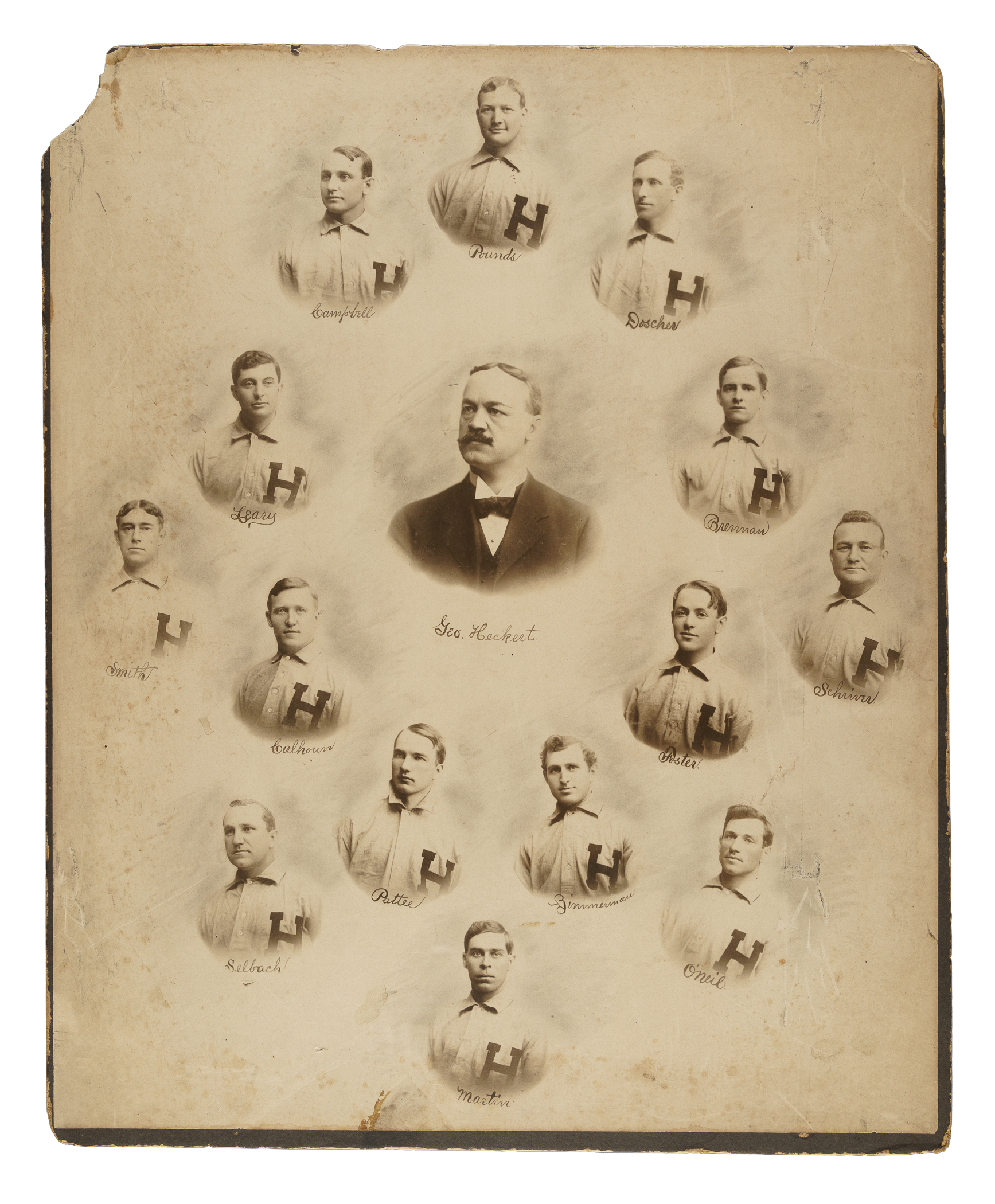 Spectacular team composite imperial cabinet featuring bust-length images of fifteen members of the 1907 Harrisburg Senators. Manager George Heckert's portrait is pictured in the center, surrounded by those of Eddie Foster, Pop Schriver, Kip Selbach, Billy Campbell, Jack Doscher, Bill Pounds, Frank Leary, Jimmie Brennan, Joe Smith, Jack Calhoun, Harry Pattee, Joe Martin, Mike O'Neill, and Eddie Zimmerman. Each player is identified in print at the base of his respective photo. Adding to both its appeal and significance is that some of the players pictured here were also featured in a number of popular early card sets, such as N172 Old Judges, E107 Breisch-Williams, and T206 White Borders. The piece (16.5 x 20.25 inches) displays light foxing (mainly on the composite photo), heavy wear to the mount, and the upper-left corner missing. The reverse of the mount has moisture staining, as well as the notation "Harrisburg, PA - 1907" written in red ink. In Poor to Fair condition overall. The size/weight of this item requires that there will be an additional shipping charge for this lot.