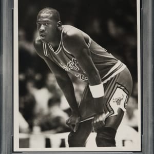 Offered is an exceptional original photograph of Michael Jordan as a member of the Chicago Bulls, circa 1985. Encapsulated and certified as an original Type I rookie-era photograph by PSA/DNA. The photo (8 x 10 inches), captures Jordan in a solo-shot with his hands on his knees during a break in the action. This is important to note as many Jordan photos depict him alongside other players. The photo presents with great clarity and the reverse displays multiple handwritten editorial notations. The PSA/DNA Letter of Authenticity notes that the photo originates from the Sporting News archive. The third overall pick in the 1984 NBA Draft, Jordan had one of the finest rookie seasons in NBA history, averaging 28.2 points, 6.5 rebounds, 5.9 assists, and 2.4 steals. He was named an All-Star starter, awarded NBA Rookie of the Year, and selected to the All-NBA Second Team. After a mid-season clash against the Boston Celtics, in which Jordan finished with 41 points, 12 rebounds, seven assists, and four steals, Larry Bird remarked, “Never seen anyone like him. Unlike anyone I’ve ever seen. Phenomenal. One of a kind. That’s what I mean about the league. With guys like him coming in from college year after year, we just can’t help but get a better image, better crowds, better TV ratings. He’s the best. Ever.” Excellent to Near Mint condition overall. Full LOA from PSA/DNA.