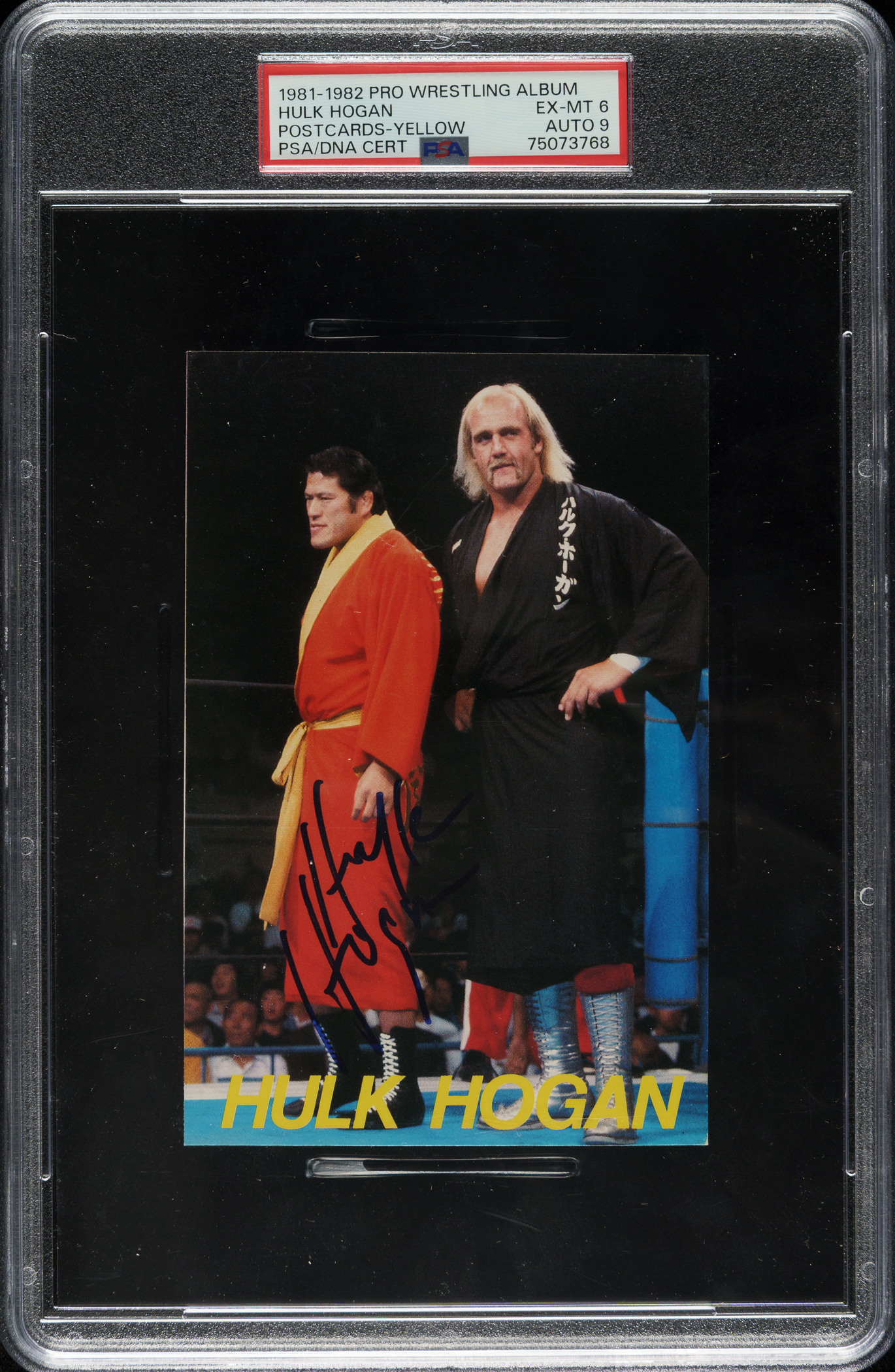 PSA/DNA has encapsulated the postcard, grading the signature MINT 9 and the card EX-MT 6. Wrestling Hall of Famer Hulk Hogan.