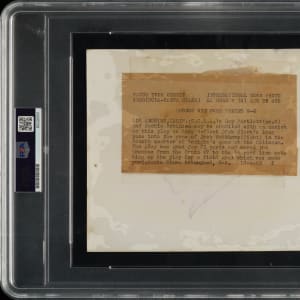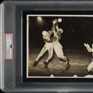 Original photo of Jackie Robinson as a member of the UCLA football team during the 1940 season. Encapsulated and certified as an original Type I photograph by PSA/DNA. Robinson (who played safety on defense) and his teammate, Ray Bartlett, are captured deflecting a pass into the hands of Jack Mathews of Santa Clara. The reverse bears the original paper news caption and an "International News Photos" credit stamp. The photo, which has been trimmed to its current dimensions of 6.5 x 8.5 inches, exhibits multiple spots of paper loss along the bottom. Fair condition overall.