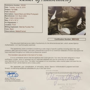 Rare photo of Ty Cobb dressed in full military uniform, signed by the legendary "Georgia Peach" in black fountain pen. Cobb has personalized the photo "To (Recipient's Name)/In Sincere Friendship/Tyrus R. Cobb." Cobb served as a captain in the United States Army's Gas and Flame Division during World War I. The photo, which bears a "G.V. Buck, Wash. D.C." credit stamp in the lower right, measures 6.25 x 10 inches (visible dimensions) and is in apparent Excellent condition overall. Matted to total dimensions of 10 x 13 inches.