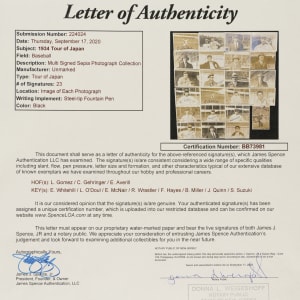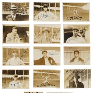 In 1934 Connie Mack led a group of Major League players on a highly publicized postseason goodwill Tour of Japan. That much-celebrated tour is especially noteworthy as it is the only overseas tour in which both Babe Ruth and Lou Gehrig participated. Offered here is a sizeable collection of twenty-three original snapshot photos, each signed in either black or blue ink by sixteen members of that celebrated 1934 tour, including Lefty Gomez, Earl Averill, Charlie Gehringer, Lefty O'Doul, Bing Miller, Eric McNair, Rabbit Warstler, two Frank Hayes, three John Quinn (umpire), two Joe Cascarella, two Clint Brown, three Earl Whitehill, Robert Schroeder (Philadelphia A's secretary), Sotaro Suzuki (interpreter), J. A. "Bud" Hillerich (of the Hillerich & Bradsby Company), and Bud Warren (part of the American contingent, undefined role). All of the photos measure 3.25 x 2.25 inches and remain in Excellent condition overall. Total: 23 signed photos. Full LOA from James Spence/JSA.