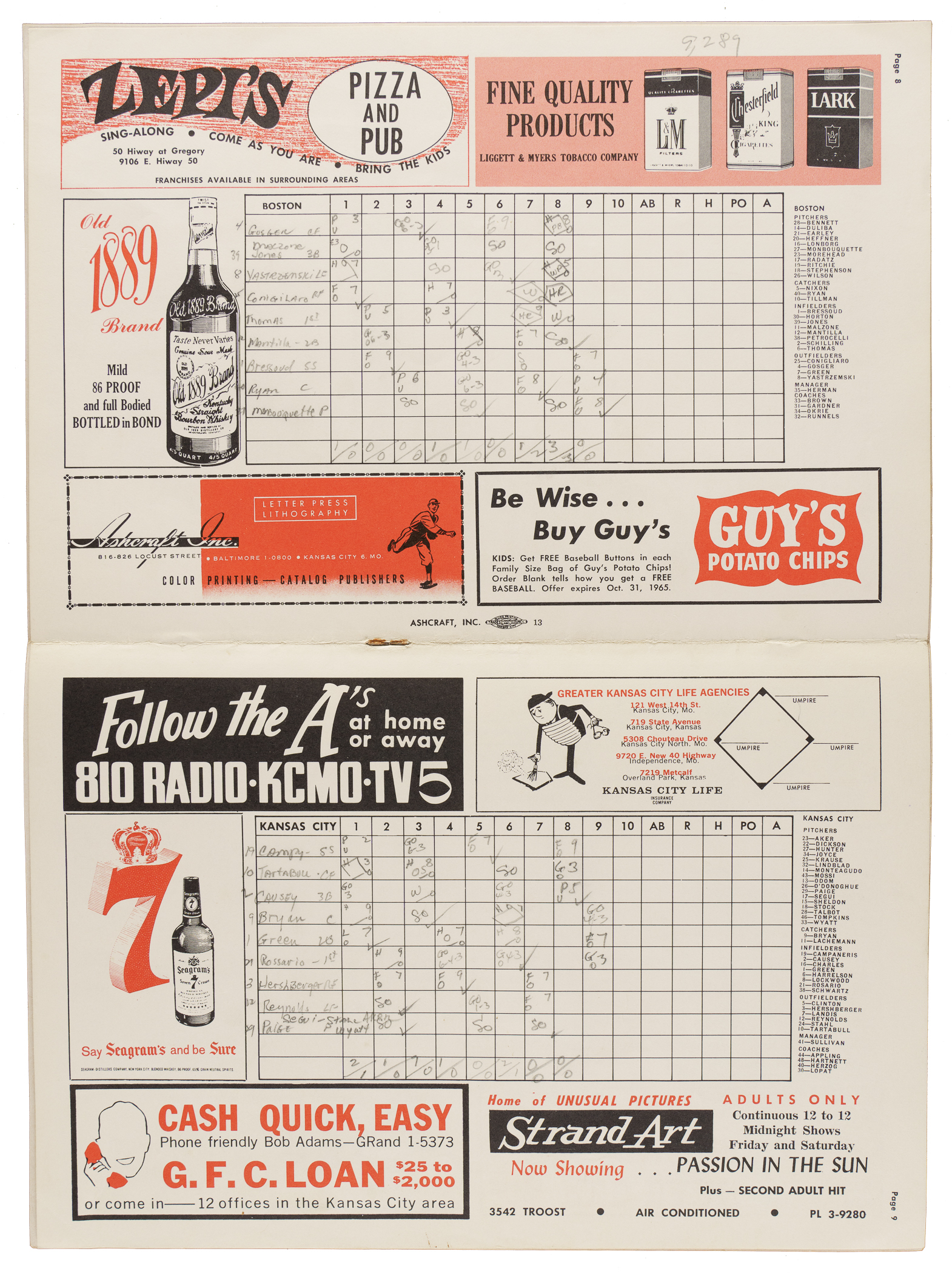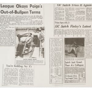 On September 25, 1965, Kansas City Athletics owner Charles Finley stole a page from Bill Veeck's promotional playbook by trotting out fifty-nine-year-old pitching legend Satchel Paige to start against the Boston Red Sox in the club's penultimate home game of the season. Prior to the game, Paige entertained the fans by sitting in a rocking chair out in the bullpen while being attended to by a nurse. However, as soon as the game started Paige showed why he was one of the greatest pitchers in baseball history. Paige allowed only one hit (a double to Carl Yastrzemski) and no runs in his three innings of work, and although he wasn't involved in the decision (the A's lost the game 5-2), he made baseball history that day by becoming the oldest player to appear in a major league game. Offered here is the original game program, together with the paper insert advertising "Satchel Paige Night," from that historic day. The 16-page program (6-7/8 x 10-1/8 inches), which is neatly scored in pencil, has light creases. The attendance of the game "9,289" is written in pencil on one of the interior scoring sheets. In Very Good to Excellent condition overall. The paper insert has a single horizontal fold, and remains in Excellent condition. Accompanied by a copy of a newspaper article detailing the game.