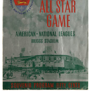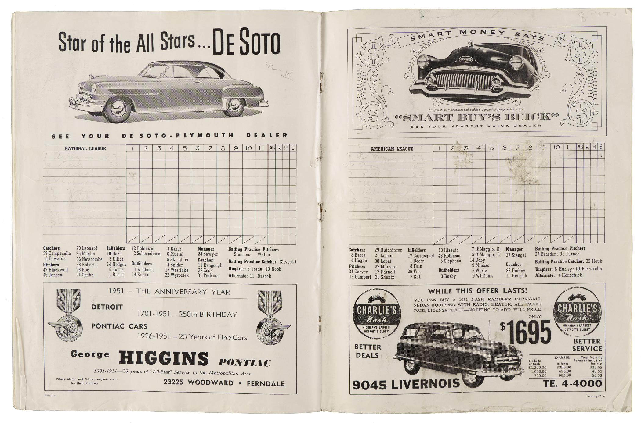 Program from the 1951 All-Star Game, held at Briggs Stadium in Detroit on July 10th. The forty page program (8.5 x 11 inches), which is not scored but the line-ups are written in pencil, displays a vertical fold line that goes through the center, scattered creases throughout, and modest wear. Good condition overall.