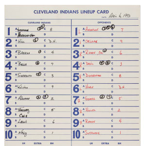 Cleveland Indians lineup card from the first Baltimore Orioles game ever played at Camden Yards on April 6, 1992. In front of a sellout crowd of 44,568, the Orioles defeated the Indians 2-0 behind Rick Sutcliffe's complete game shutout. The lineup card (9 x 14 inches) is filled out in the hand of Chuck Cottier, who was an Orioles coach and traditionally filled in the team's lineup cards. This lineup card was not used to track changes during the game. It remains in Excellent condition overall.