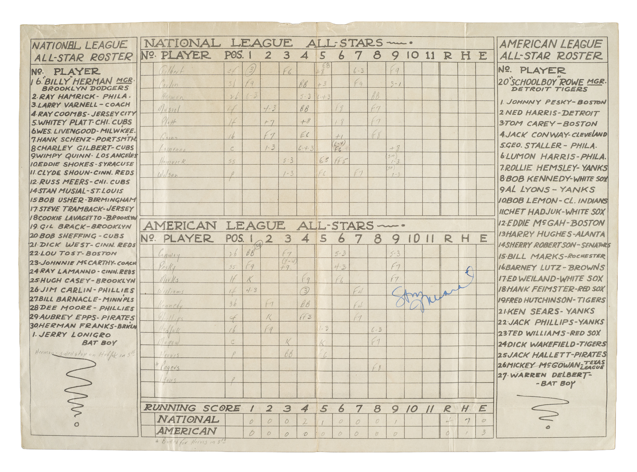 September 1945 Service Stars of the American League vs. National League fold-over scoring sheet signed along the interior by Stan Musial in blue ink. The paper scorecard (14 x 10 inches, unfolded), which is neatly scored in pencil to record a 4-0 National League victory, is in Fair condition overall. Full LOA from James Spence/JSA.