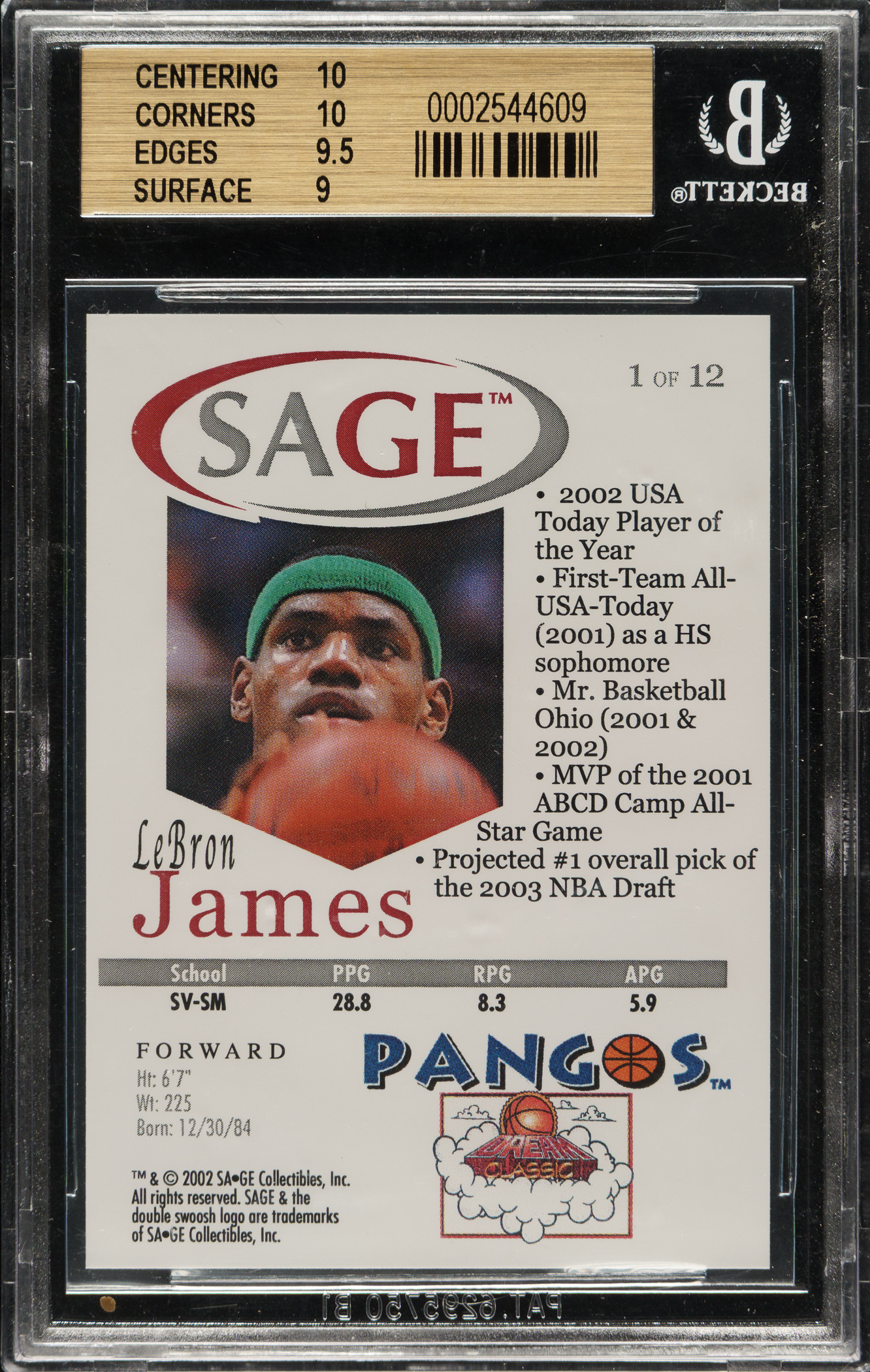 2002-2003 Sage Pangos Basketball #1 LeBron James Rookie BGS GEM MINT 9.5
