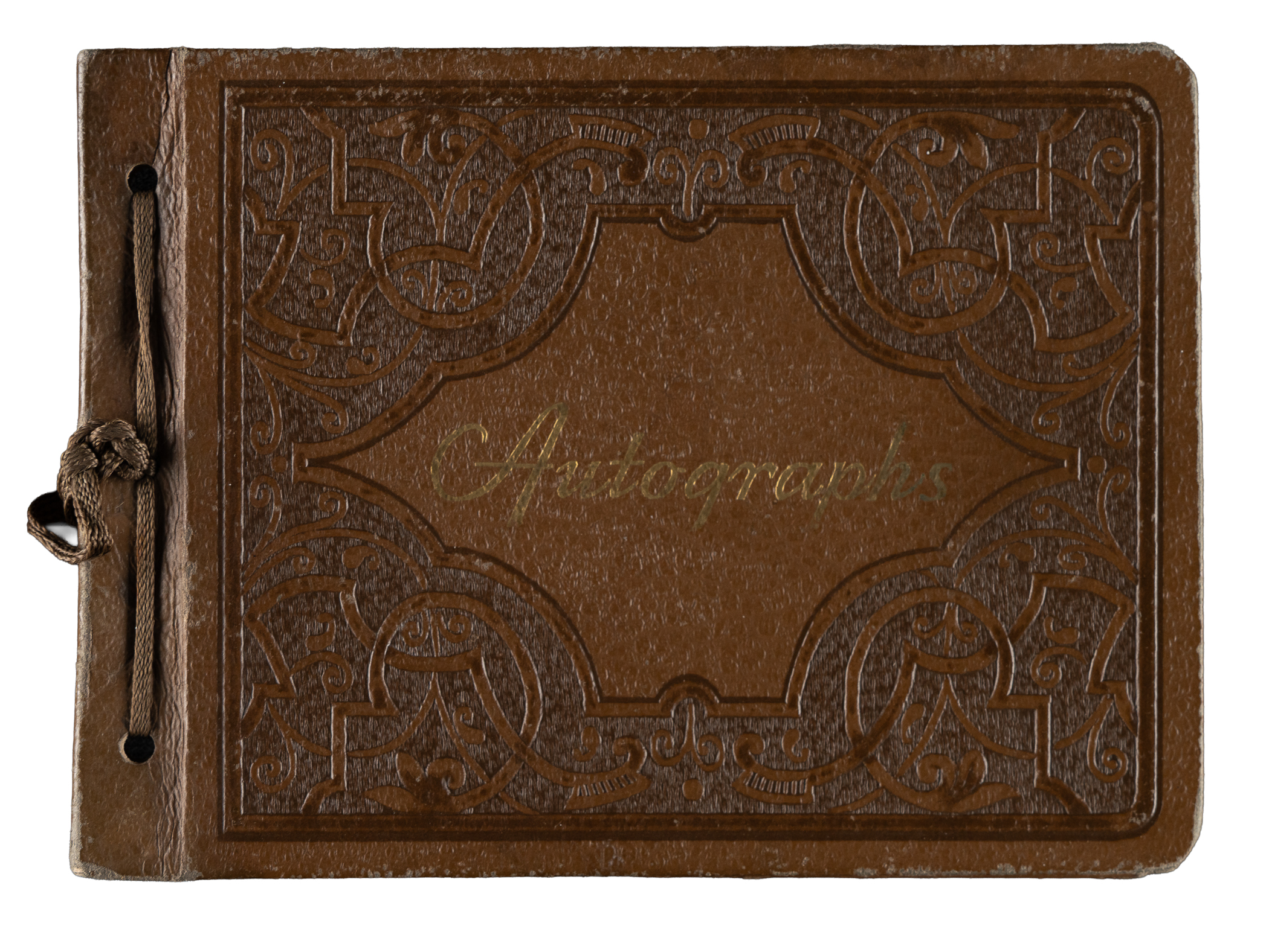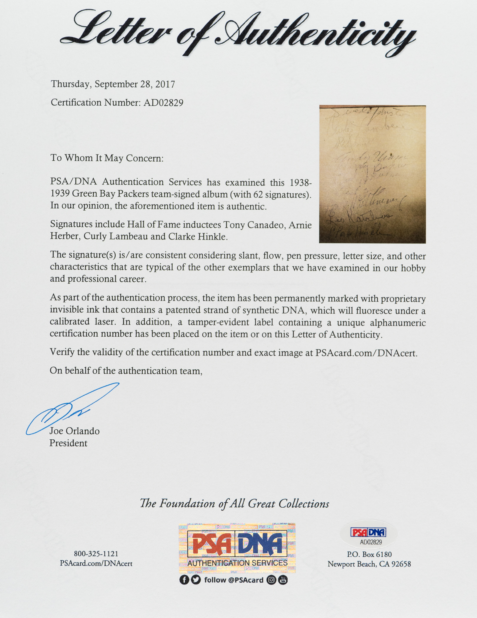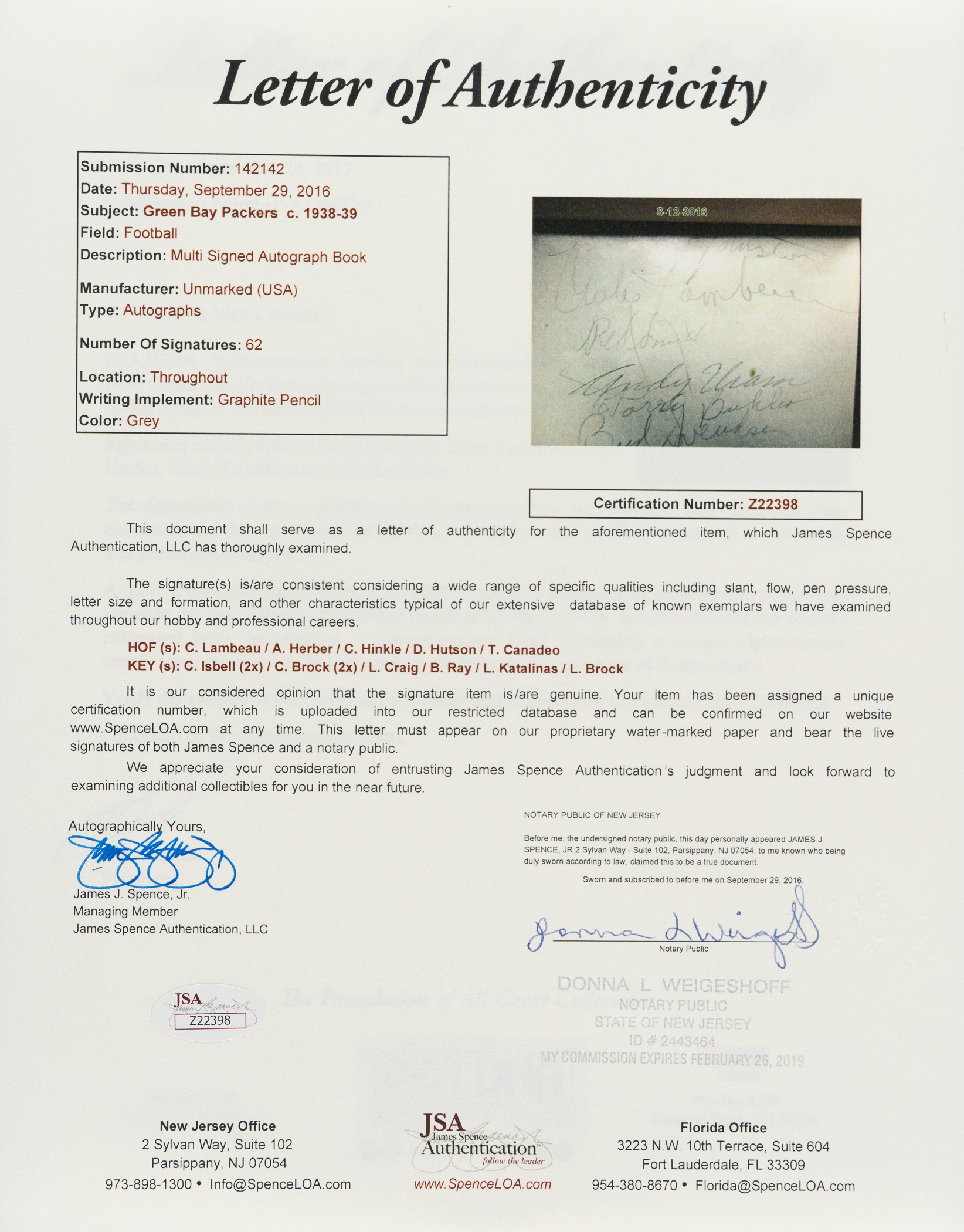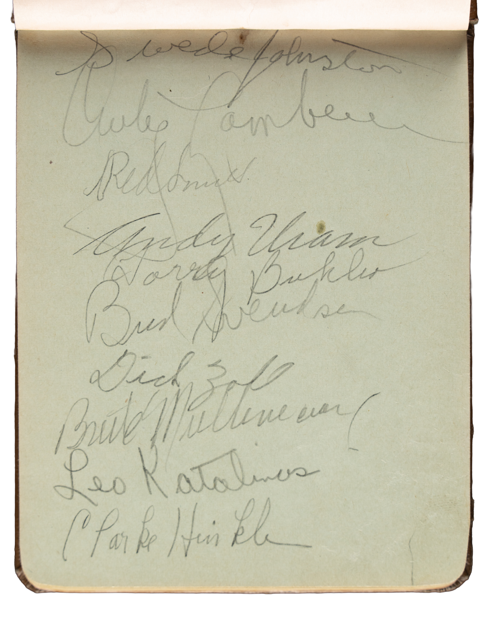 Vintage autograph book featuring 62 signatures from the 1938-1939 Green Bay Packers. Each signature is written in pencil. Notable signatures include Lambeau, Herber, Hinkle, Hutson, Canadeo, Isbell, Becker, Engebretsen, Fritsch, Gantenbein, Goldenberg, Johnston, Letlow, Ray, Smith, Biolo, Jacunksi, Jankowski, Katalinas, Lee, Schneidman, and Uram. The original owner's name and hometown are neatly penned along the inside cover. The book (4.5 x 6 inches) is in Excellent condition overall. Full LOA from PSA/DNA. Full LOA from James Spence/JSA. The size/weight of this item requires that there will be an additional shipping charge for this lot.