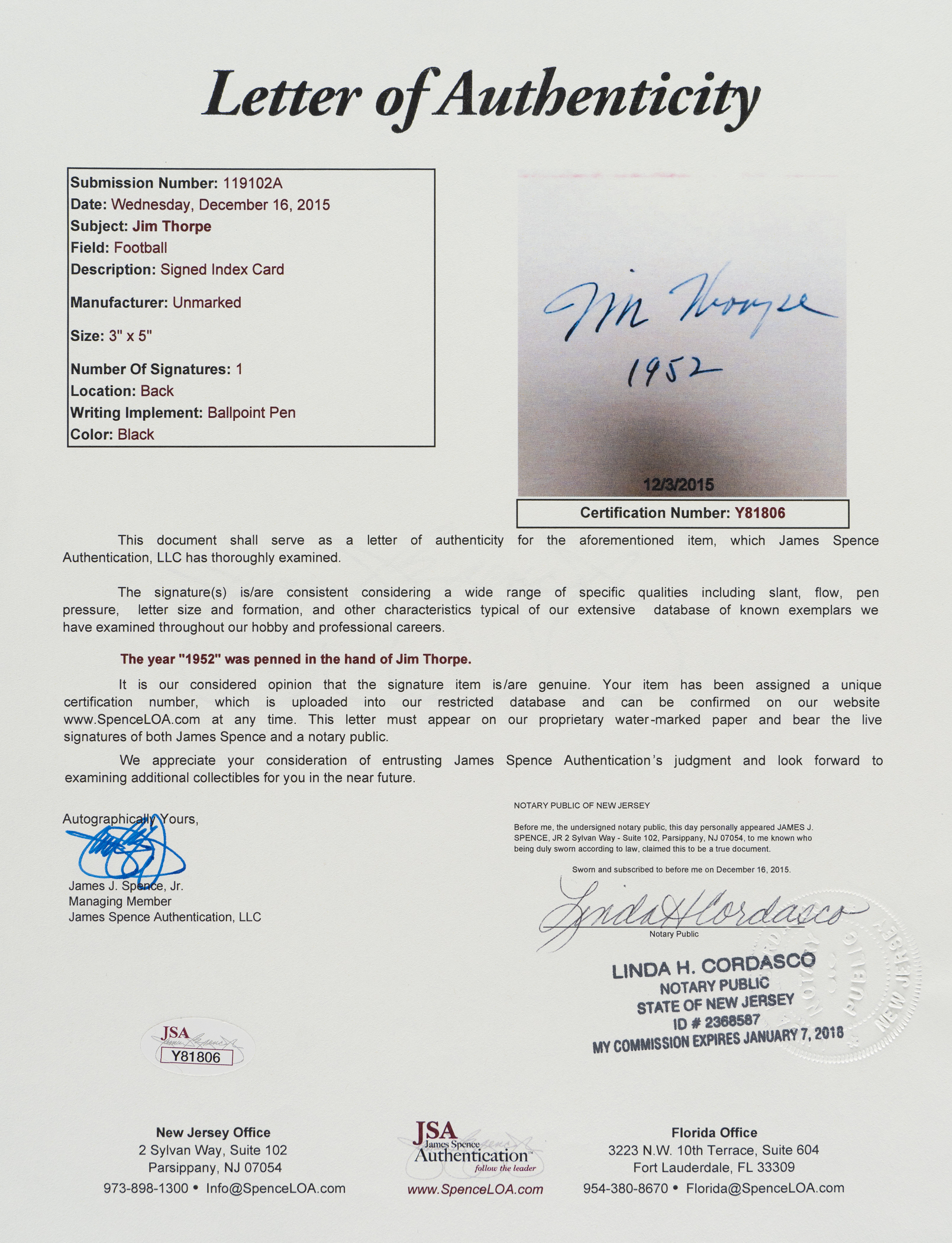 Football Hall of Famer Jim Thorpe. Full LOA from James Spence/JSA.