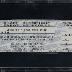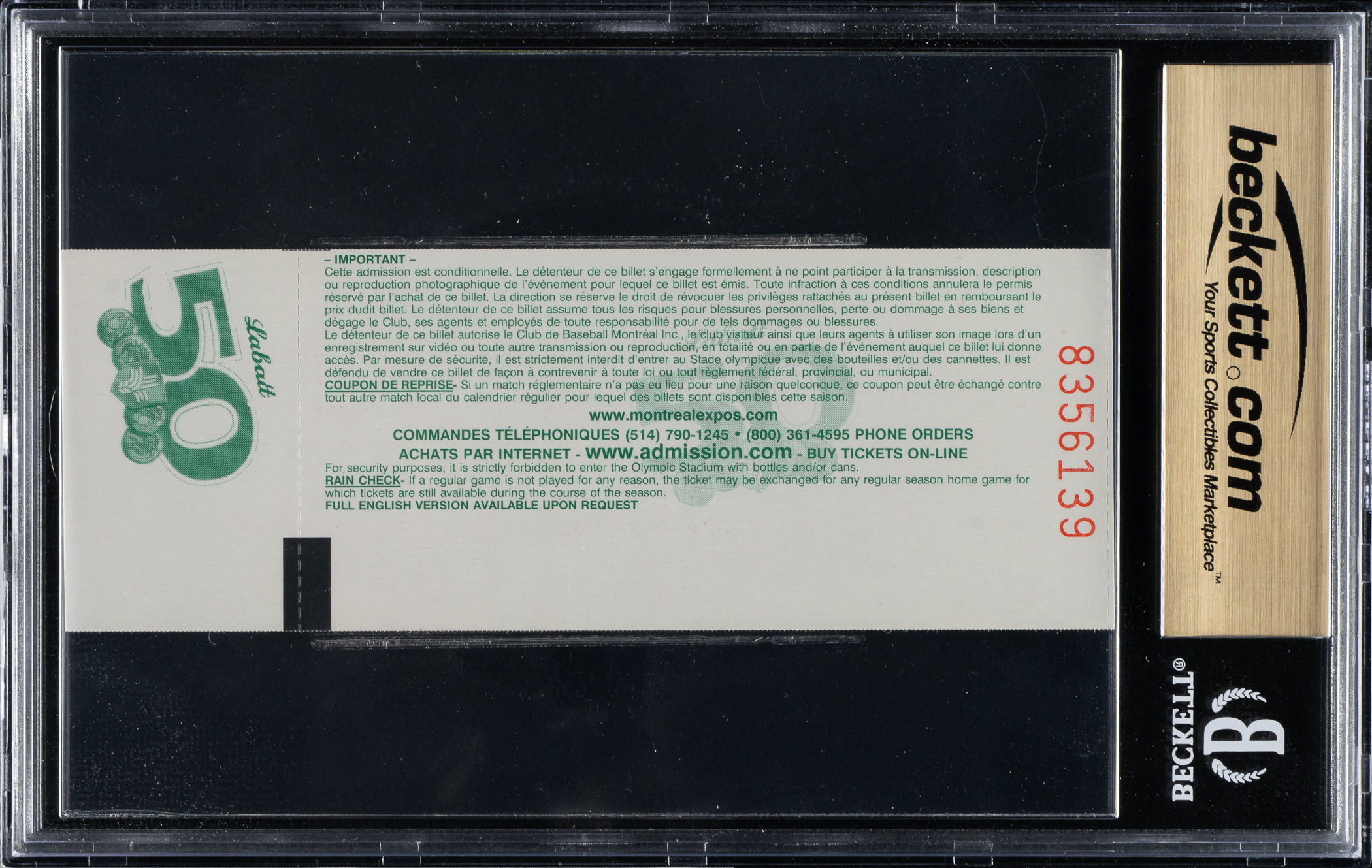August 6, 1999 Montreal Expos (vs. San Diego Padres) Full Ticket BGS GEM MINT 10 - Tony Gwynn 3,000th Hit
