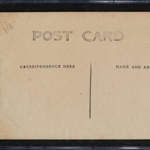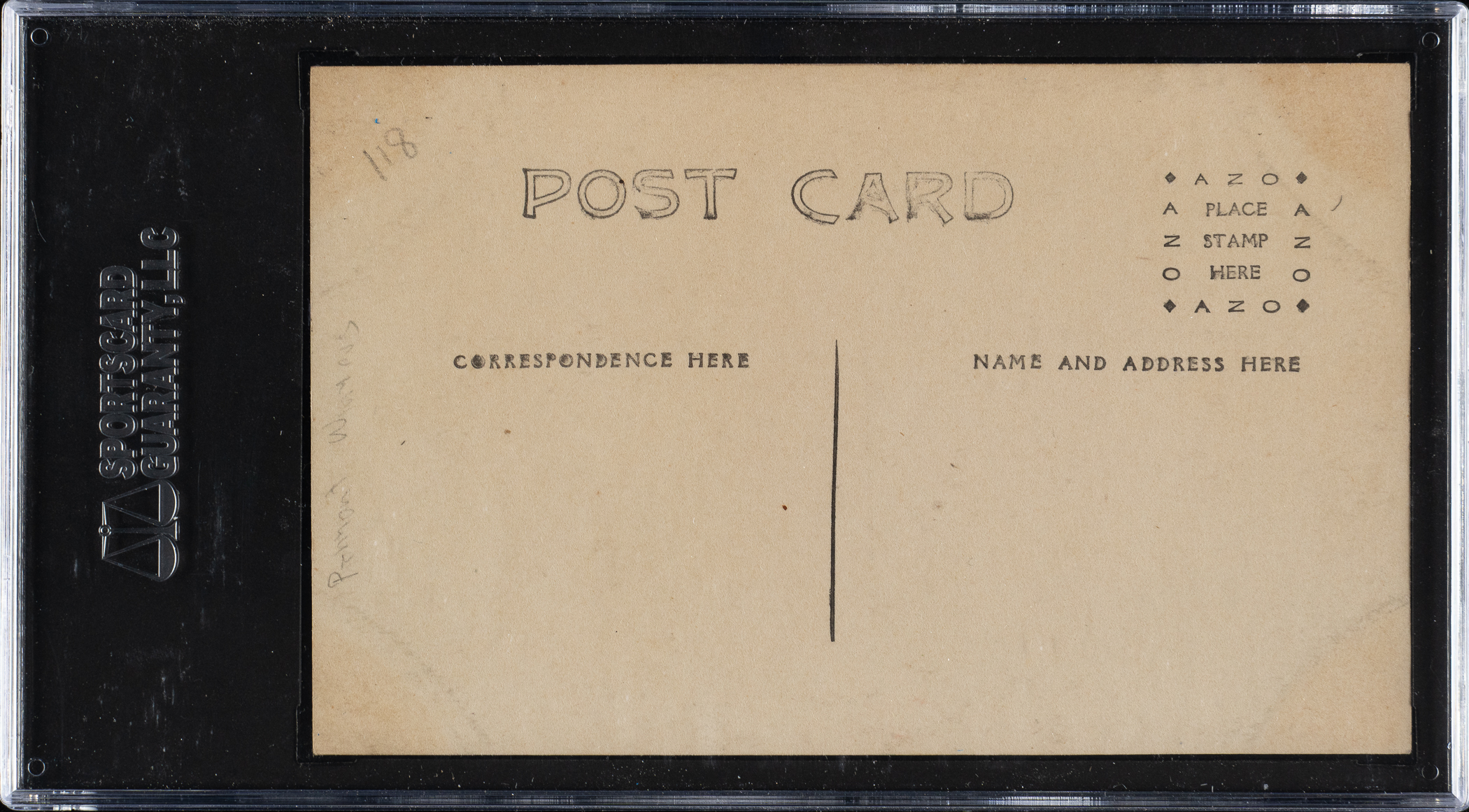 Graded GOOD 2 by SGC. Real-photo postcard capturing 20 members of the 1907 American League Champion Detroit Tigers in a classic team pose, including Ty Cobb in his rookie season, manager Hughie Jennings, Sam Crawford, George Mullin, and Germany Schaefer. The white-letter caption along the base reads “Detroit’s 1907.” 1907 marked the first of Detroit’s three consecutive American League Championship seasons, all of which ultimately ended with a World Series loss. The postcard (5.5 x 3.5 inches), which has not been addressed or mailed, displays light corner wear, discoloration of the corners from where it was likely mounted in an album, a small stain near the right border, and minor edge chipping. "Pennant Winners" and "118" have been written in pencil on the reverse. This is a superb example of this early Detroit Tigers postcard dating from Ty Cobb's rookie season.