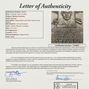 Philadelphia Athletics Hall of Famer Mickey Cochrane. Full LOA from PSA/DNA.