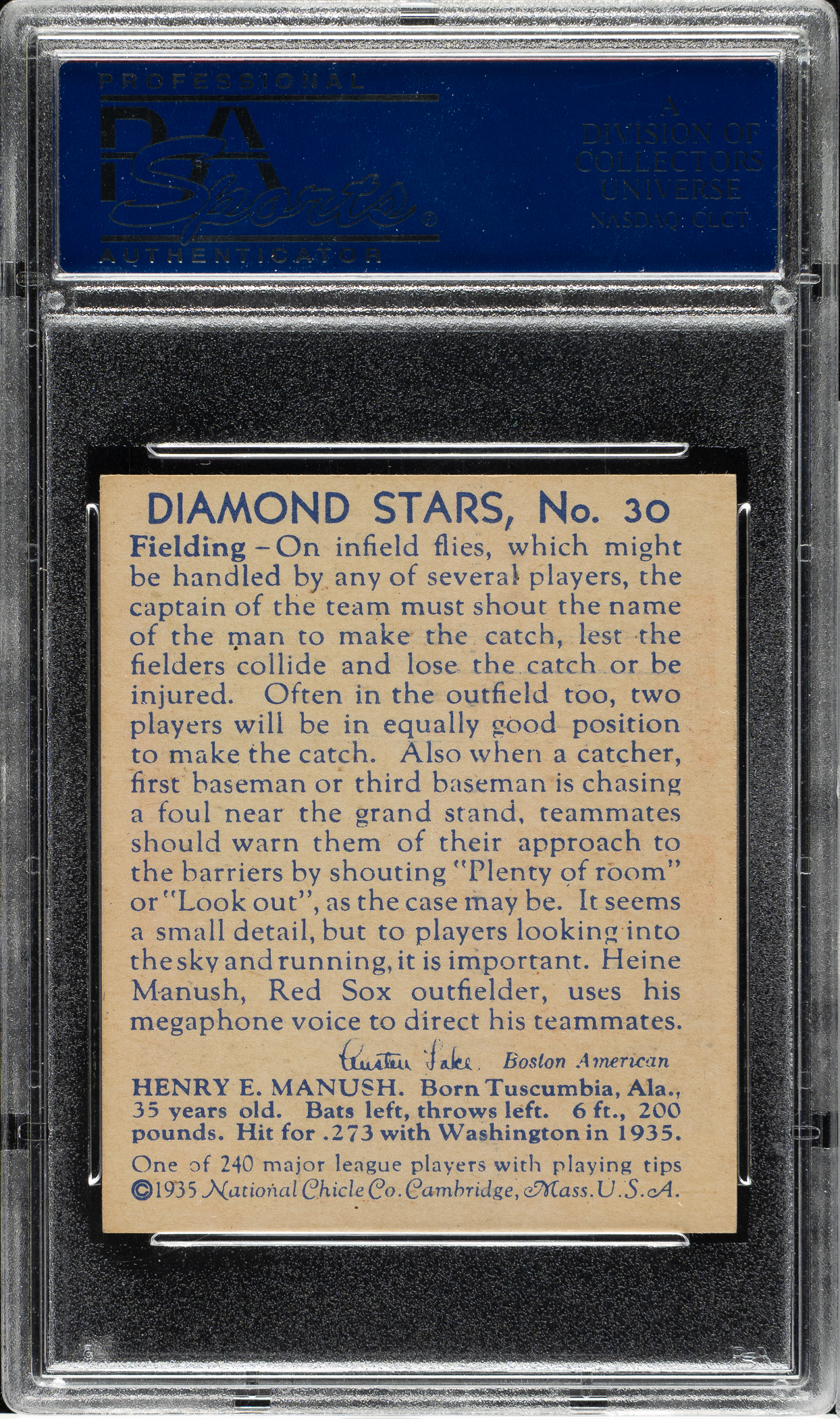 1934-1936 R327 Diamond Stars #30 Heinie Manush No "W" on Sleeve (1936 Blue Back) PSA NM-MT 8