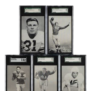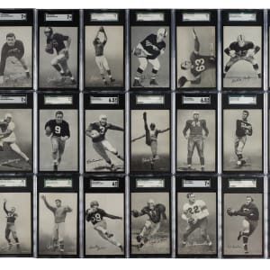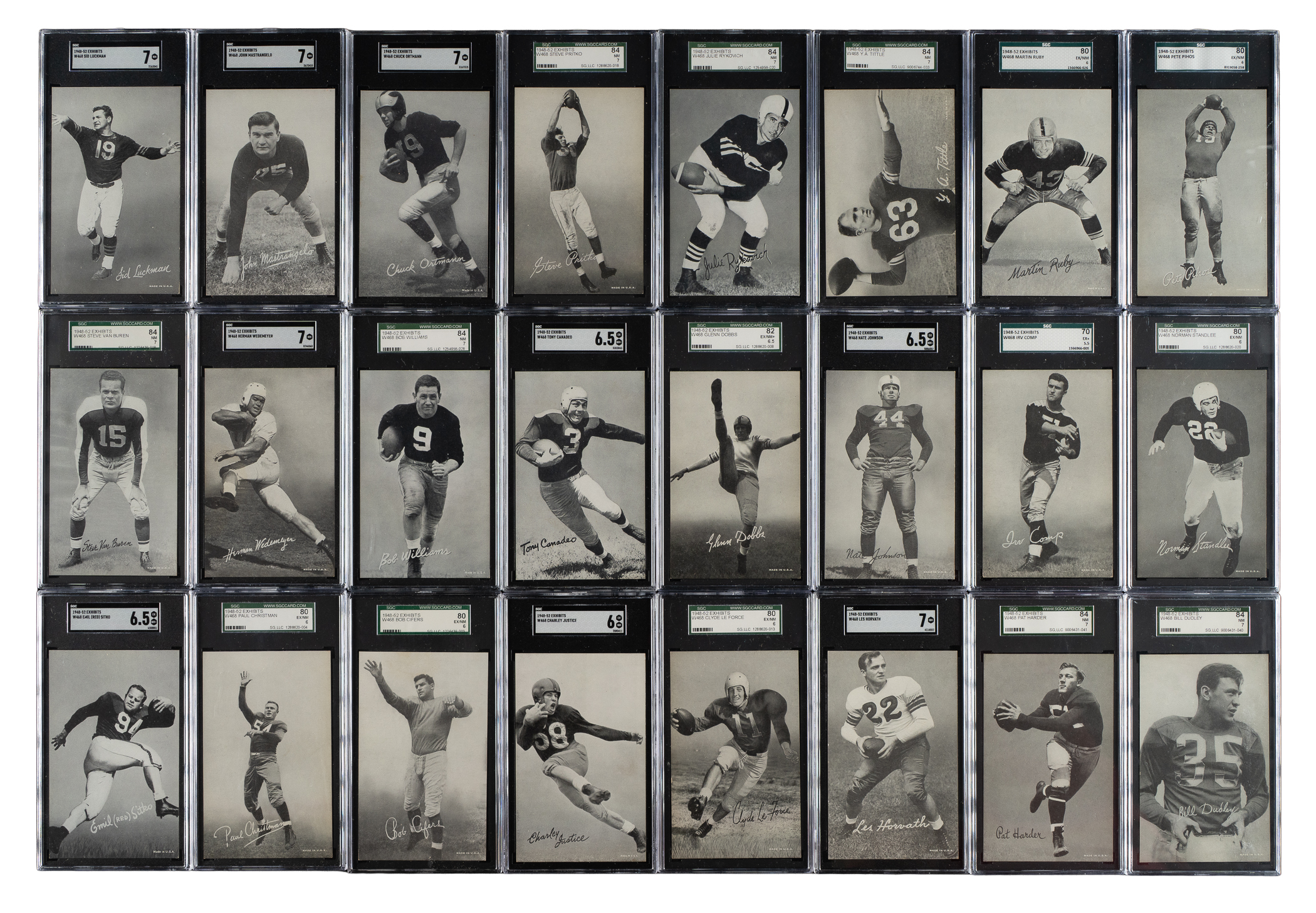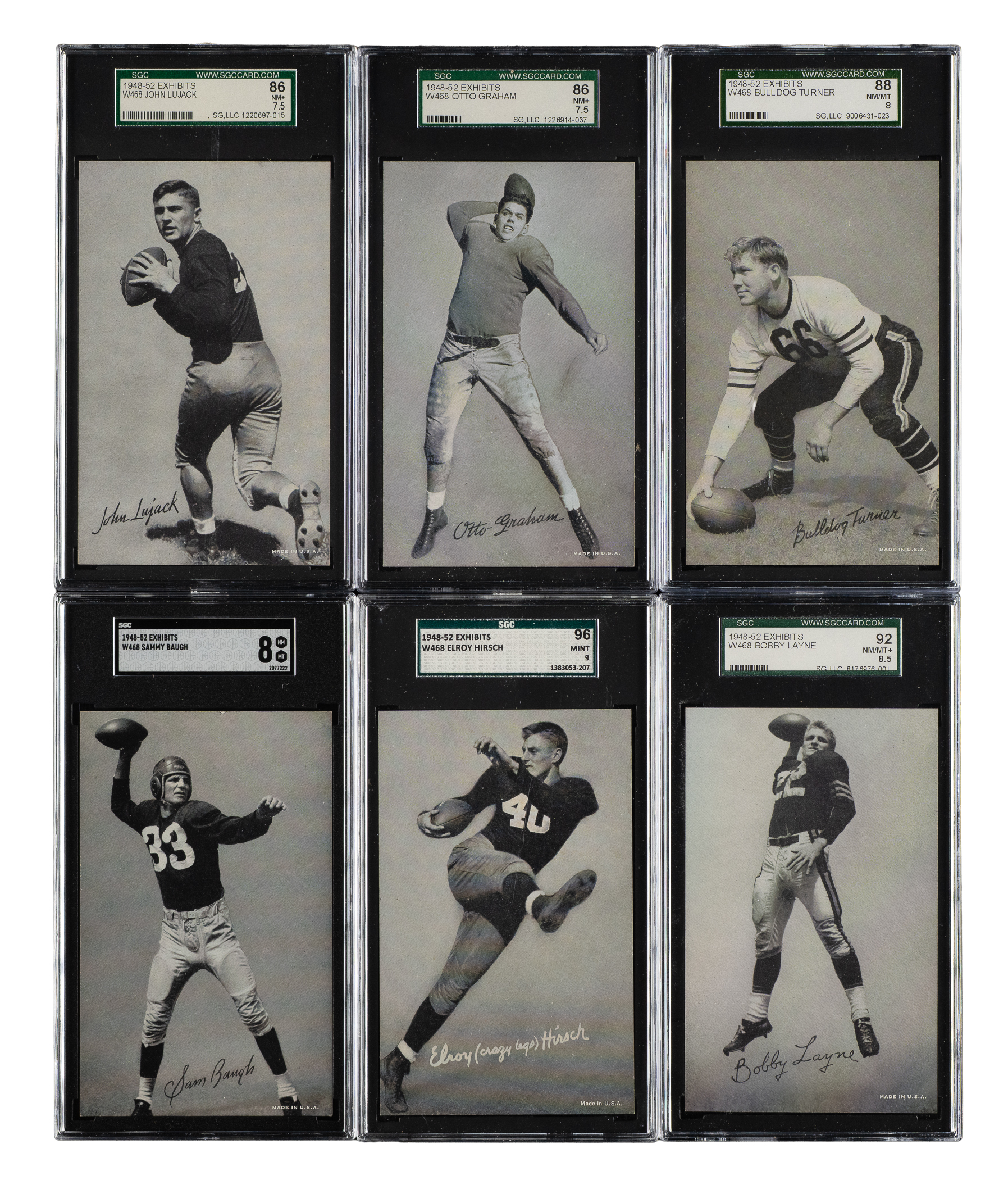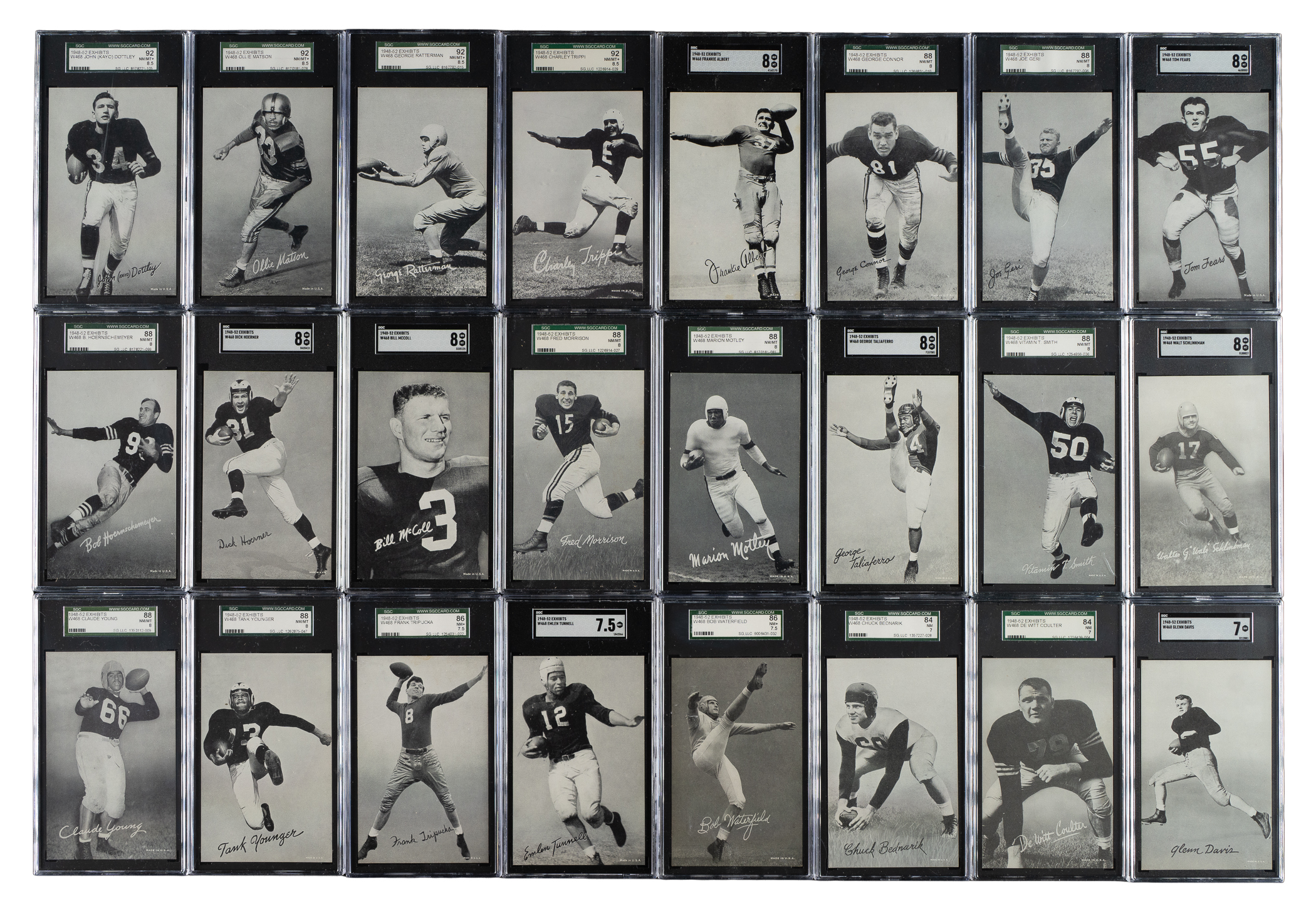 Offered is an extraordinary high-grade complete 59-card set of 1948-1952 W468 Exhibits Football cards, one of the most substantial, yet perhaps most overlooked, vintage football sets from the postwar era. Includes key card Herman Wedemeyer and numerous Hall of Famers and short prints that make this set so difficult to complete. The classic Bowman sets from the era have naturally always been on all football-card collectors' radars, but there is little else in the way of major football sets from these key years (1948-1952). The Exhibit card series is a rare exception. Issued over four years (1948-1951) by the Exhibit Supply Co. of Chicago, this black-and-white football-card set features many of the greatest legends of the day. The cards produced in 1951 were also issued in sepia-tone in 1952. (The cards in this set are all black-and-white and include the short prints unique to 1948-1951.) Each card is professionally graded and encapsulated by SGC. SGC Grading Composite: MINT 96 (1 card): Hirsch. NM/MT+ 92 (5 cards): Dottley, Layne, Matson, Ratterman, and Trippi. NM/MT 88 (16 cards): Albert, Baugh, Connor, Fears, Geri, Hoernschemeyer, Hoerner SP, McColl, Morrison, Motley, Schlinkman SP, Smith, Taliaferro, Turner, Young, and Younger. NM+ 86 (10 cards): Barwegan, Conerly, Graham, Jacobs SP, Lujack, Perry, Rhodemyre, Tripucka, Tunnell, and Waterfield. NM 84 (15 cards): Bednarik SP, Coulter SP, Davis SP, Dudley, Harder, Horvath SP, Luckman, Mastrangelo SP, Ortmann, Pritko SP, Rykovich, Tittle, Van Buren, Wedemeyer SP, and Williams. EX/NM+ 82 (4 cards): Canadeo, Dobbs, Johnson SP, and Sitko. EX/NM 80 (7 cards): Christman, Cifers SP, Justice, Le Force SP, Pihos, Ruby SP, and Standlee. EX+ 70 (1 card): Comp SP. This is a crisp, fresh, and mostly high-grade complete set of one of the most overlooked of all football issues. Total: 59 cards. The size/weight of this item requires that there will be an additional shipping charge for this lot.