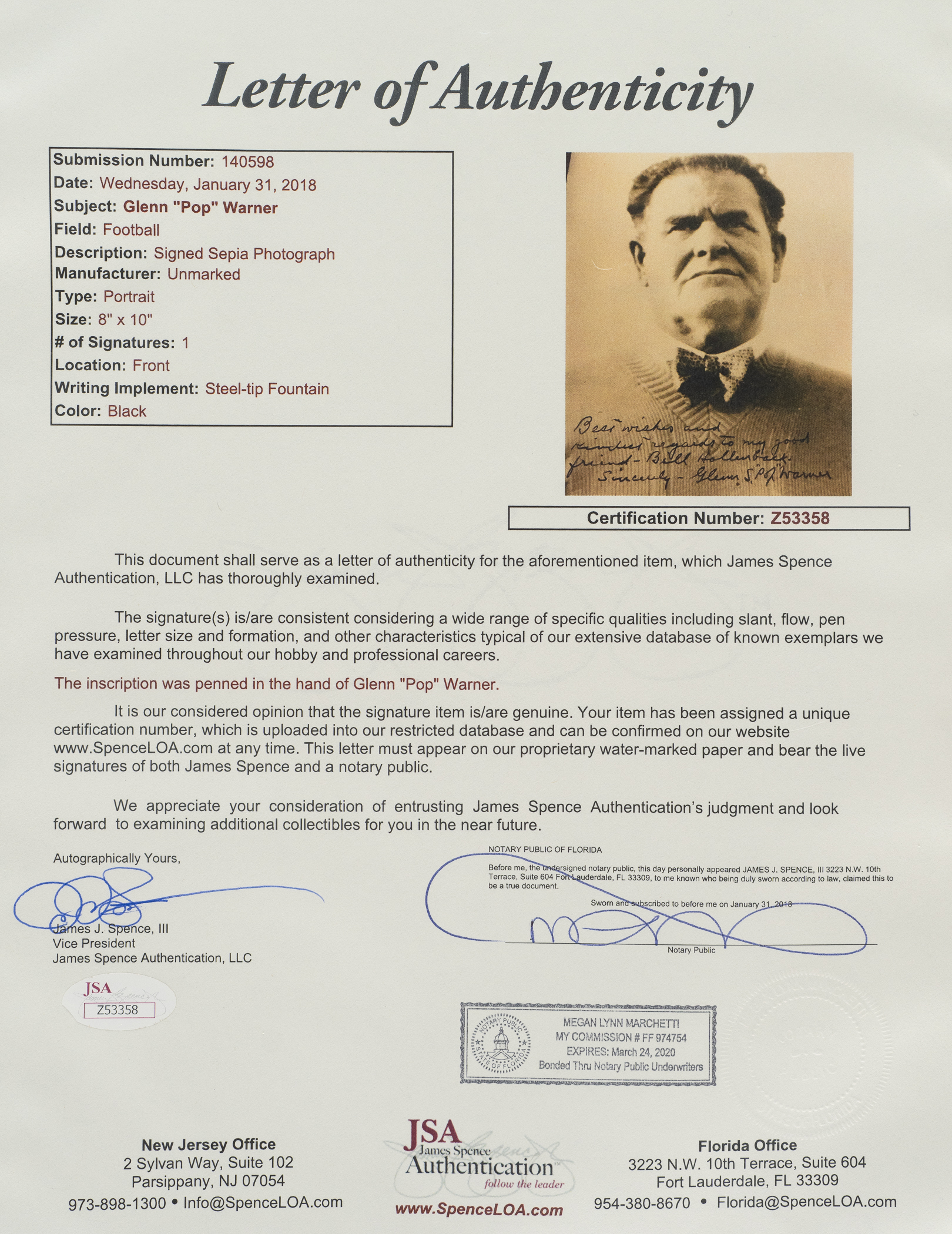 College football Hall of Famer Glenn "Pop" Warner. Total dimensions: 8 x 10 Inches. Full LOA from James Spence/JSA.