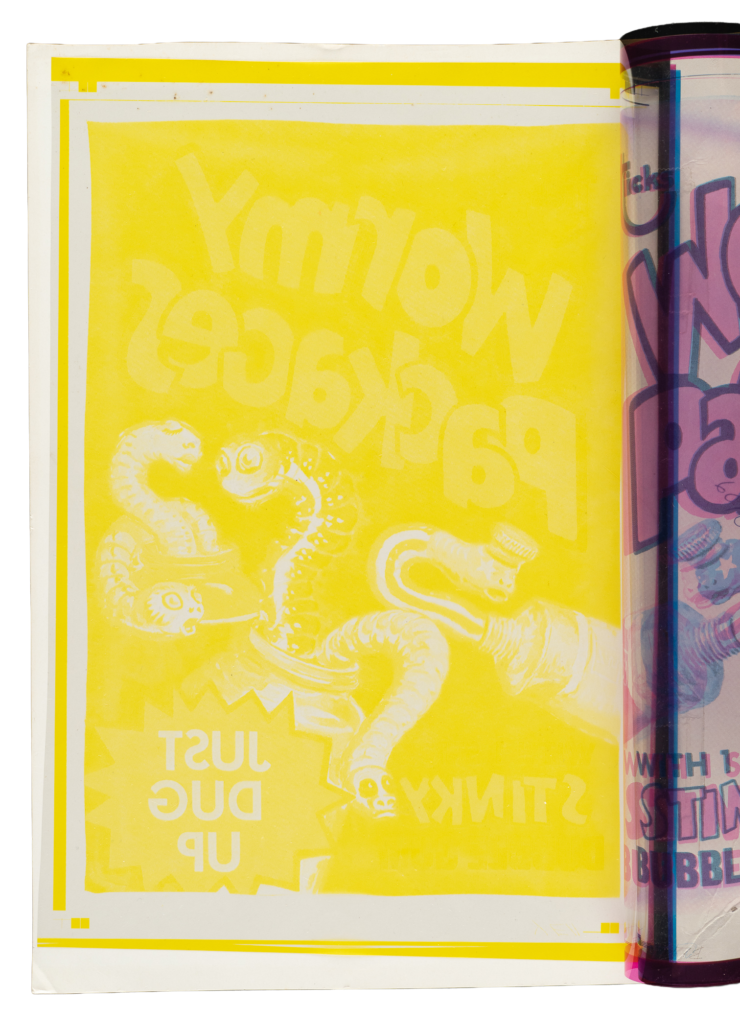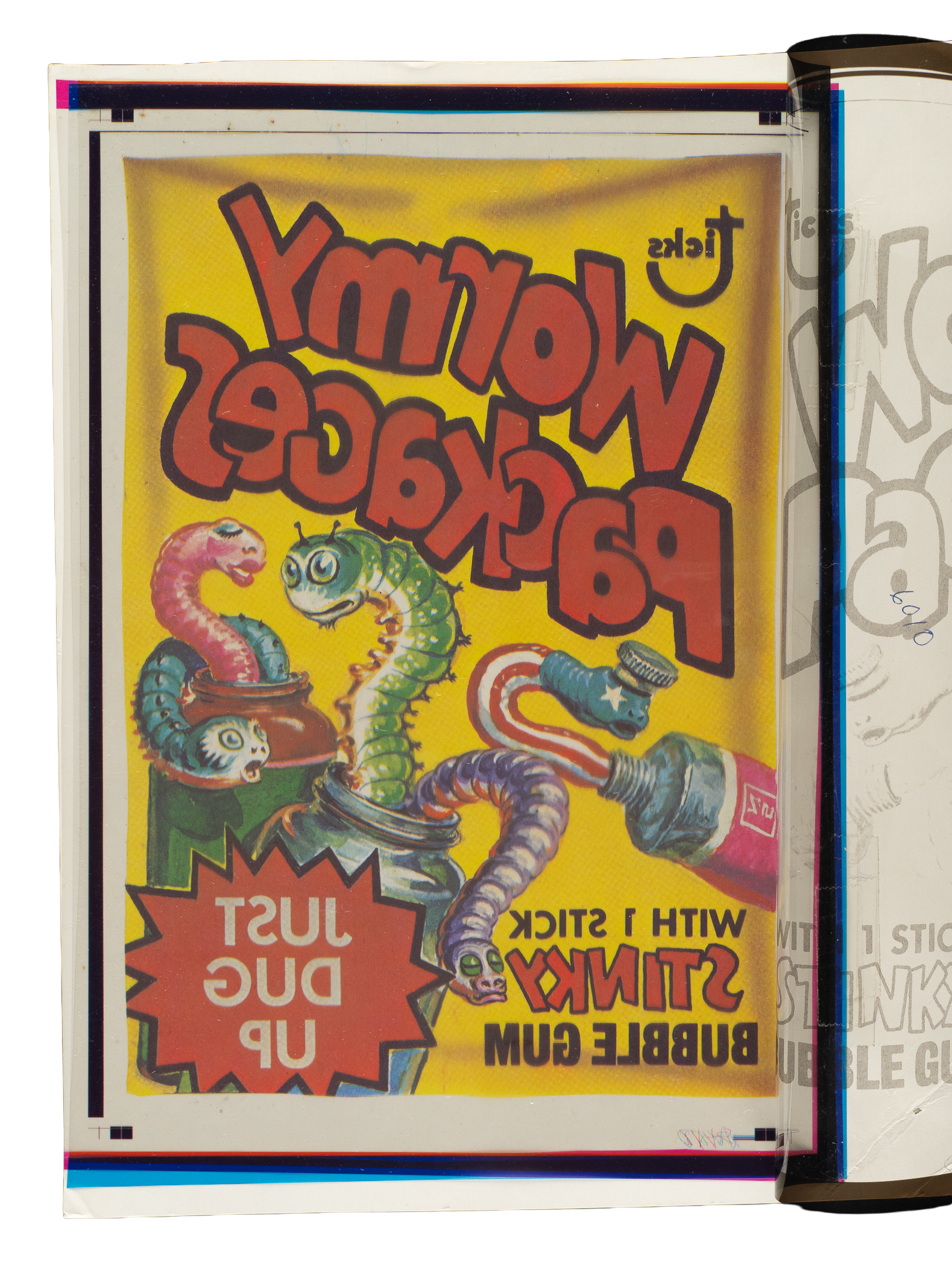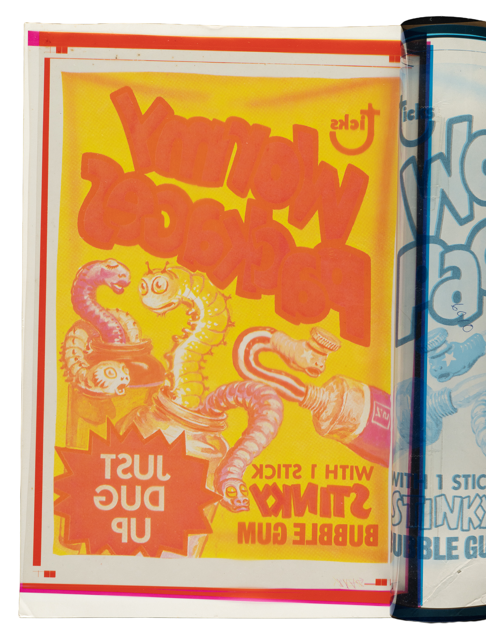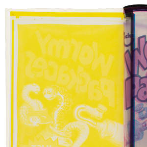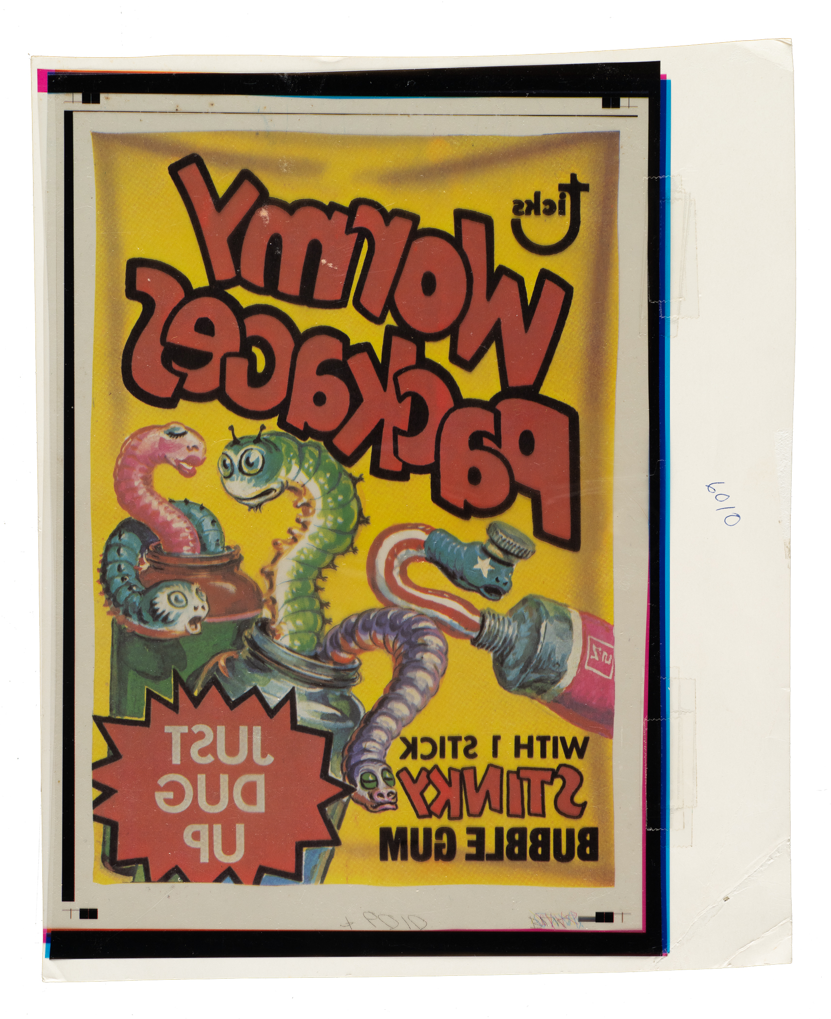 Fascinating original production artwork consisting of four-color separation acetate overlays used to produce the 1973 fourth series "Wormy Packages" title sticker. This series of artwork includes all four colors from the production process (magenta, black, cyan, and yellow). Each acetate sheet measures approximately 8-3/16 x 12 inches, and all remain affixed by means of tape to the original cardstock. Each of the acetates and corresponding cardstock bear the marking "#6010," which relates to Topps' internal production art department process. This is the only original four-color separation acetate overlay we can recall having seen available for sale. This is an outstanding original production artwork from one of the most famous and enduring series of the 1970s.