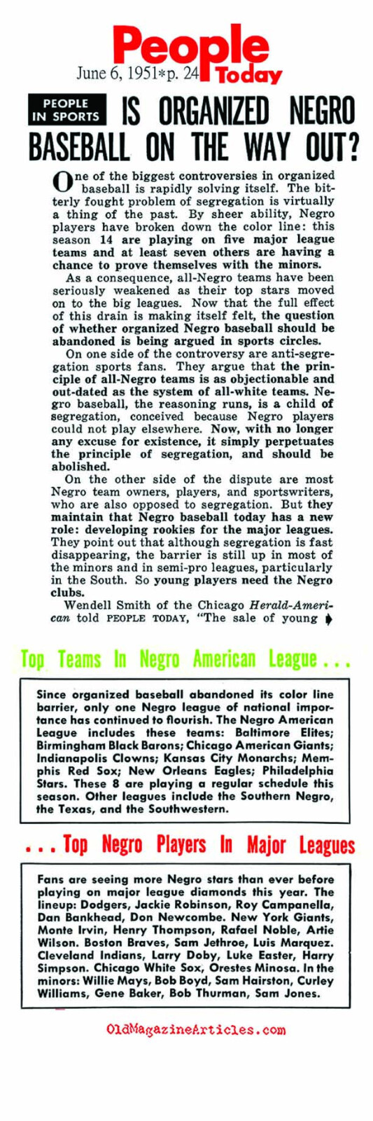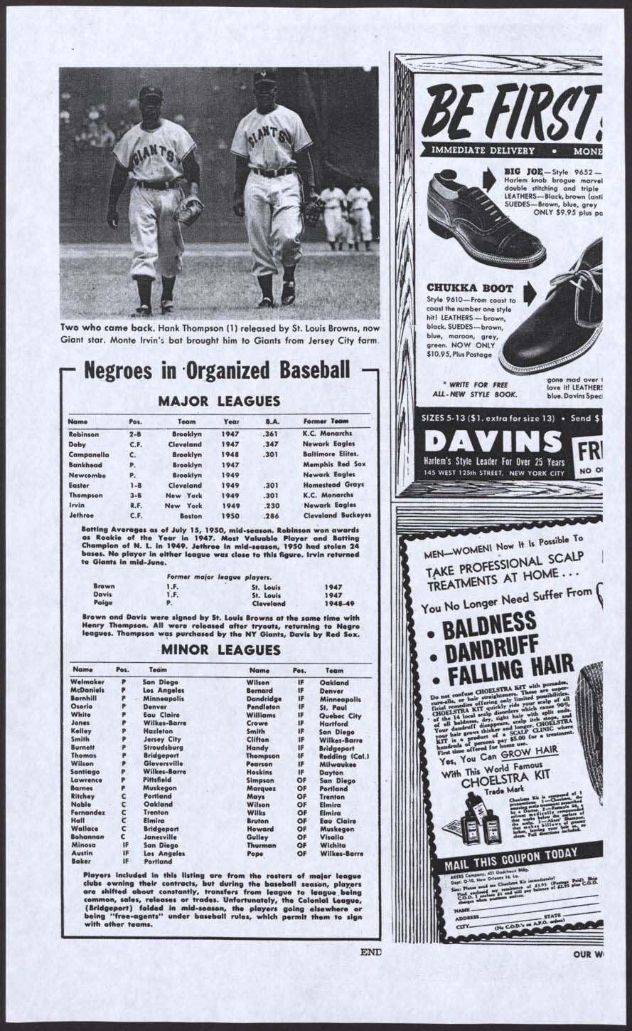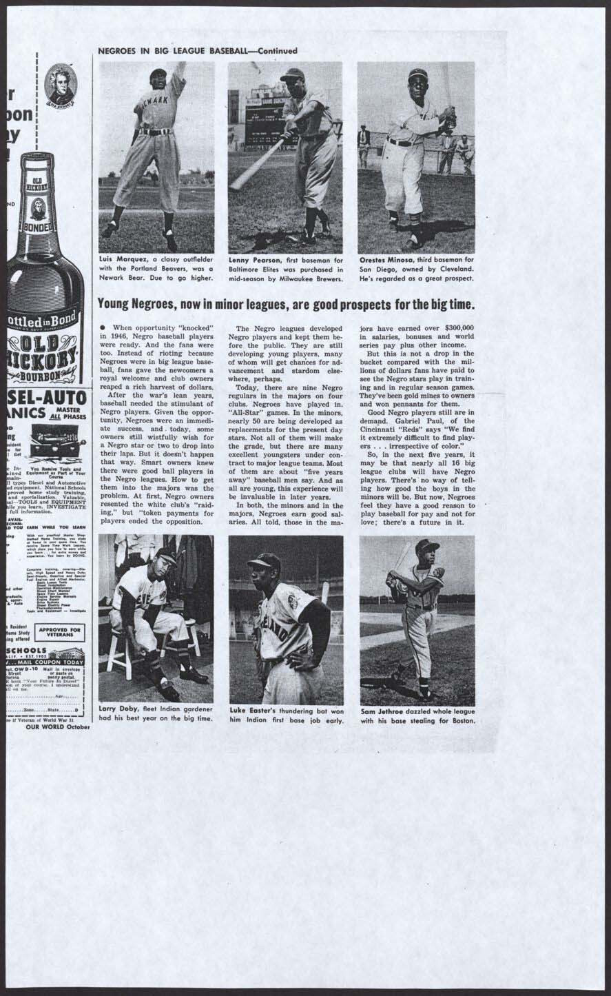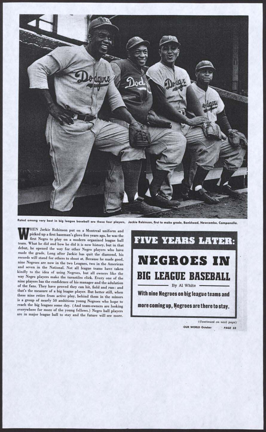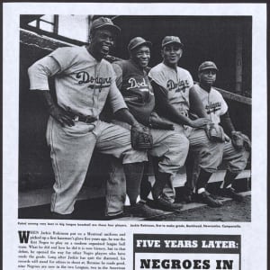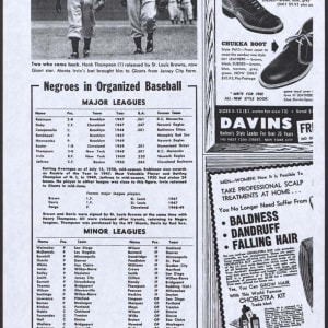 Presented is a fascinating and unusual large photographic premium depicting the only nine African American baseball players in the Major Leagues during the 1950 baseball season, with Hall of Famers Jackie Robinson, Roy Campanella, Monte Irvin, and Larry Doby as the highlights. While not much is known about the specific origin of this piece, extensive research by our consignor has arrived at "Our World" magazine as a potential explanation for its creation. "Our World" magazine was produced from 1946 to 1957 for a primarily African American audience and served to promote and inform its readers on a variety of contemporary issues. In the October 1950 issue, an article written in July 1950 by Al White titled "Negroes in The Big Leagues" is presented and focuses on the nine African American players at the Major League level. (A copy of this article is presented online for review, but an original does not accompany this piece.) It is a possibility that this piece was created for promotional purposes - perhaps in conjunction with this article - but the project, which may have been to cultivate African American interest in sport or for use as an anti-racism campaign, was never pursued. Each of the images of the players included is from very early in their respective careers and in most cases can be tied to different photographers. The absence of credit and further information may suggest that permission for distribution was not granted. Additionally, research shows an article from the "People In Sports" column titled “Is Organized Negro Baseball On The Way Out?” from the June 6, 1951, issue of "People Today" magazine. (A copy of this article is presented online for review, but an original does not accompany this piece.) It is clear from both articles that promoting African Americans in the Major Leagues was gaining traction. Measuring 11 x 14 inches, the piece is printed on semi-glossy photographic paper and is high quality in its presentation. While the piece does suffer a number of condition issues, including a part of the upper left corner missing, it remains a significant piece with outstanding subject matter from this critical time in Major League history.