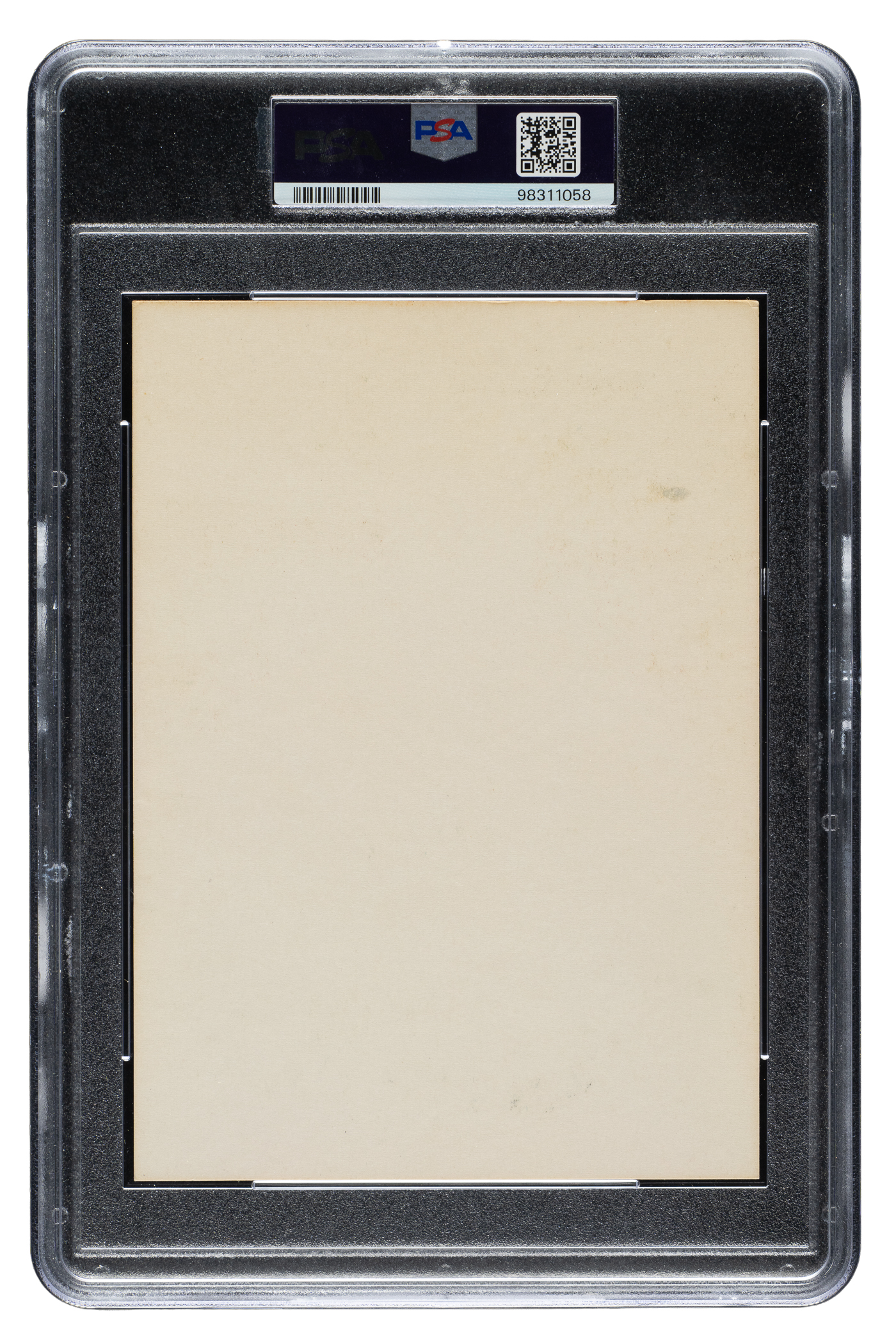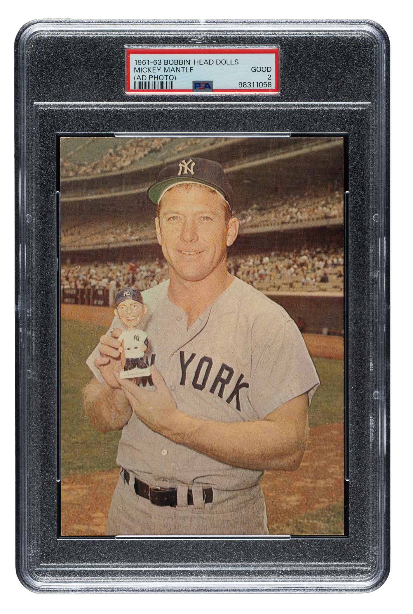 Rare Mickey Mantle advertising card (5 x 7 inches) issued in promotion of Mantle's 1961-1963 bobbing-head doll. Graded GOOD 2 by PSA, the card presents at a much higher level, consistent in our opinion with Vg-Ex to Ex examples, but is downgraded due to multiple light wrinkles. The colorful card pictures Mantle on the field holding an example of his bobbing-head doll. These cards are seldom seen in any condition. An outstanding example of this scarce card and the perfect compliment to any Mantle bobbing-head doll.