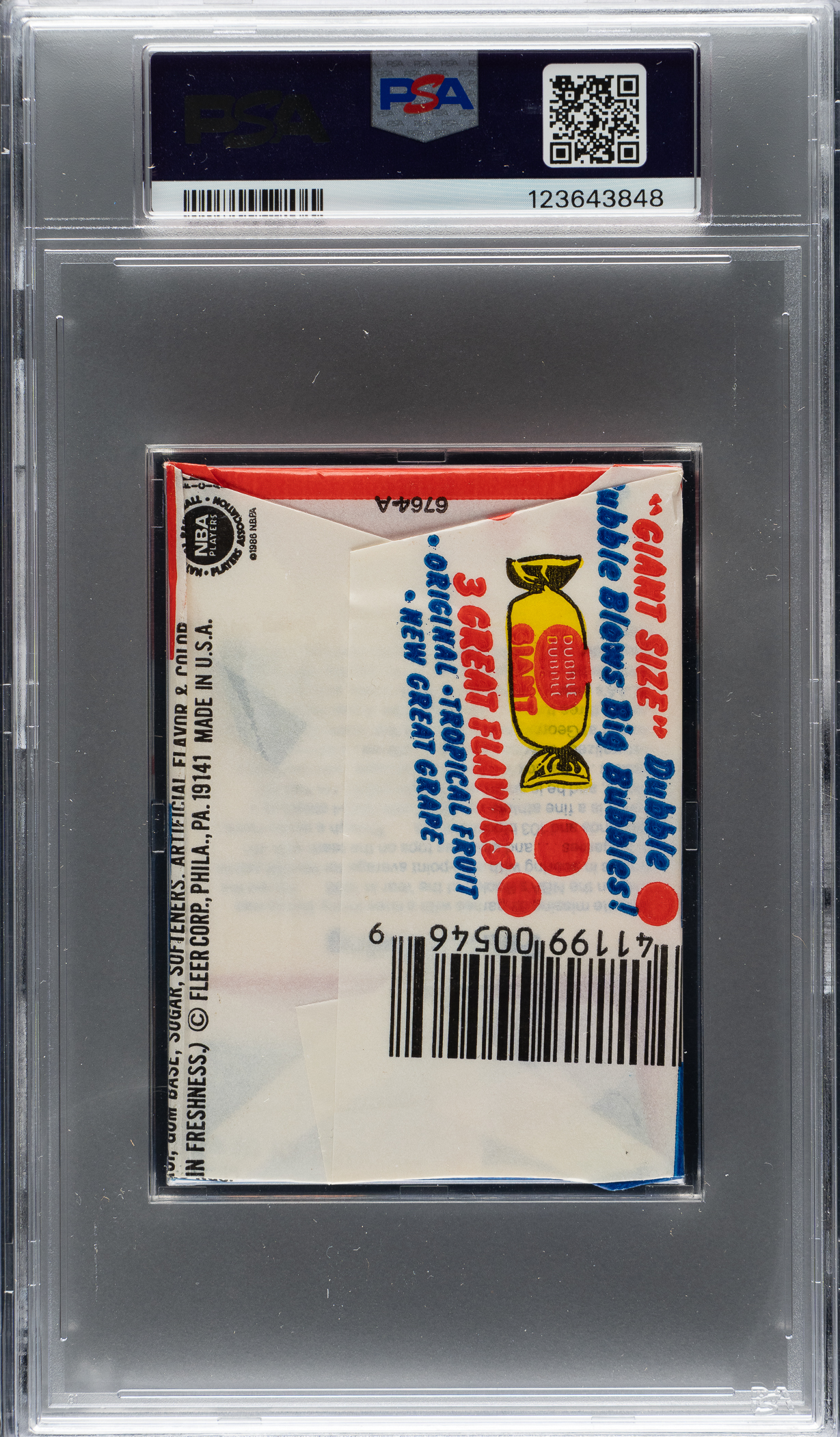 Graded NM-MT 8 by PSA. High-grade original unopened wax pack of 1986-1987 Fleer basketball cards, designated as exhibiting a Patrick Ewing Sticker on the reverse. This set marks the first basketball set produced by Fleer since 1961. Fleer stopped producing basketball cards after 1961 while its powerhouse competitor Topps continued to rule the basketball-card market from the late 1960s until the early 1980s. This set is loaded with superstars and rookie cards of future Hall of Famers, highlighted by the rookie card of Michael Jordan. Crisp, clean unopened wax pack in virtually perfect condition. The pack displays a beautiful full-color wrapper, a tight seal, no staining, and original gloss. This is an outstanding unopened pack of 1986-1987 Fleer, one of the most popular of all basketball issues.