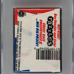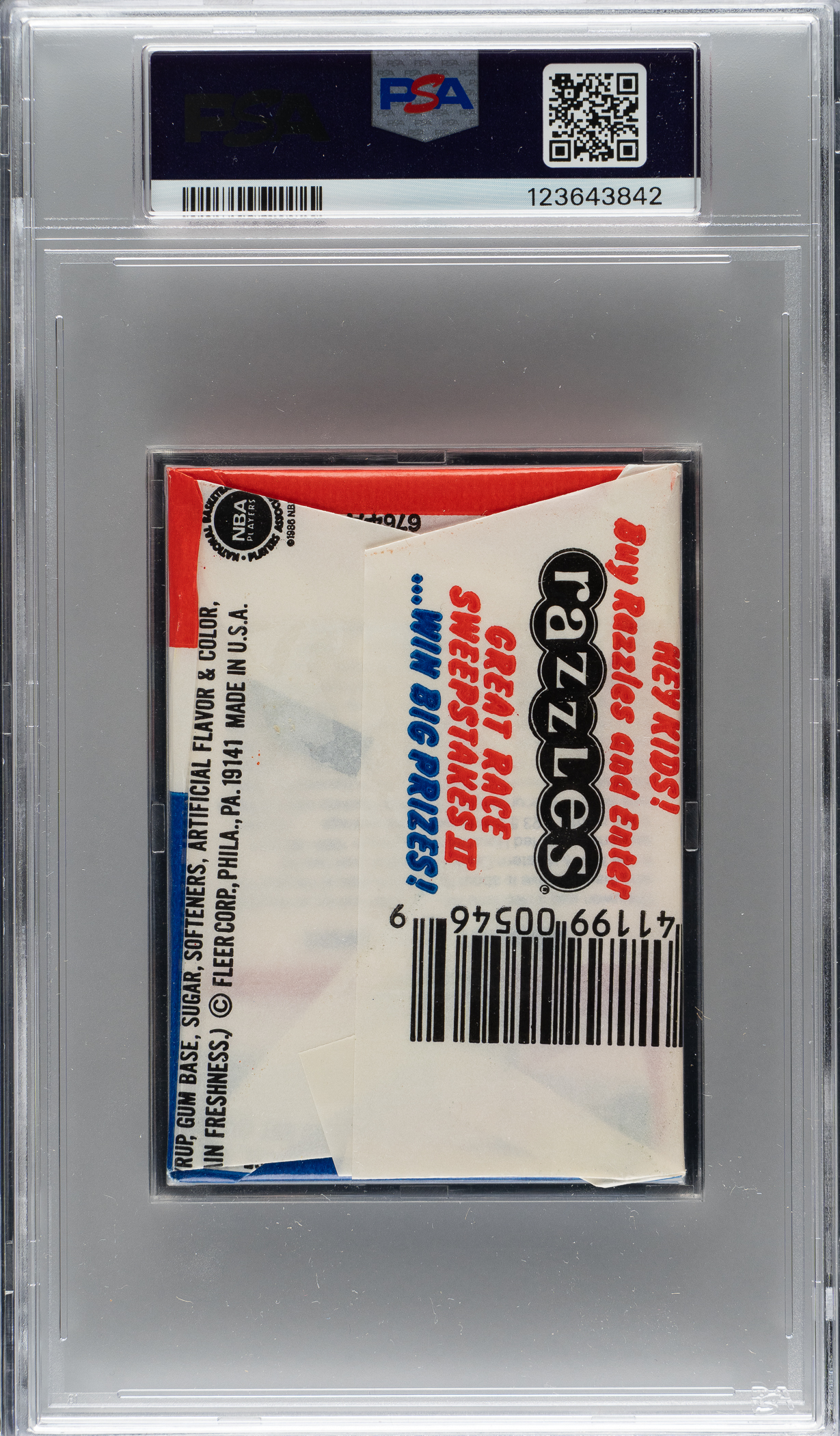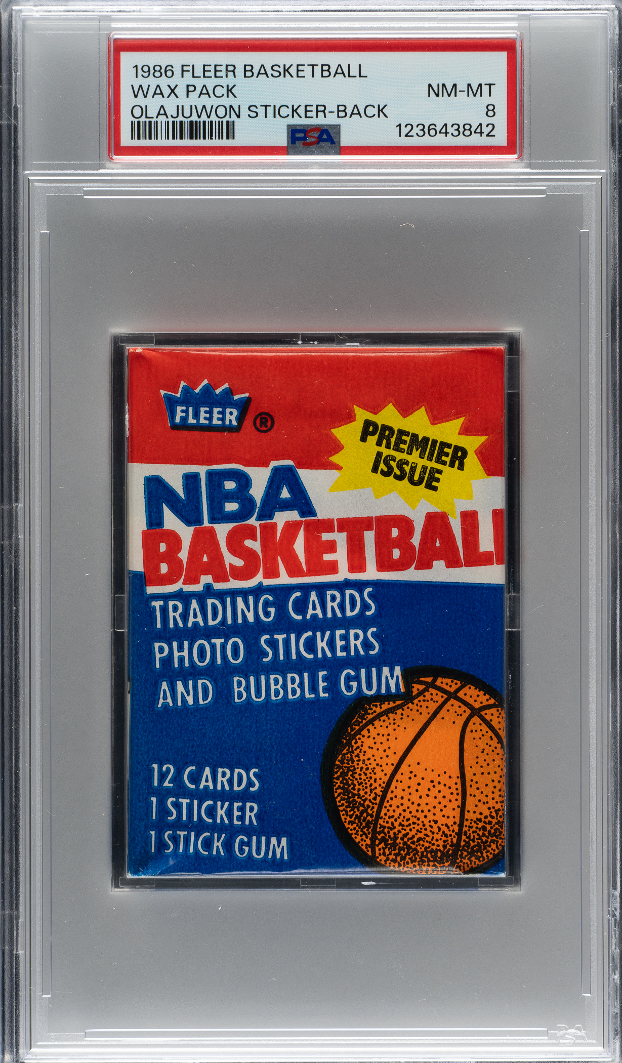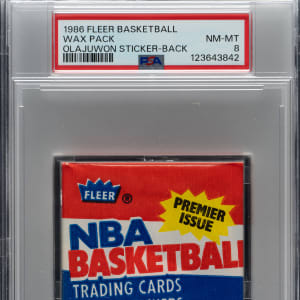 Graded NM-MT 8 by PSA. High-grade original unopened wax pack of 1986-1987 Fleer basketball cards, designated as exhibiting a Akeem Olajuwon Sticker on the reverse. This set marks the first basketball set produced by Fleer since 1961. Fleer stopped producing basketball cards after 1961 while its powerhouse competitor Topps continued to rule the basketball-card market from the late 1960s until the early 1980s. This set is loaded with superstars and rookie cards of future Hall of Famers, highlighted by the rookie card of Michael Jordan. Crisp, clean unopened wax pack in virtually perfect condition. The pack displays a beautiful full-color wrapper, a tight seal, no staining, and original gloss. This is an outstanding unopened pack of 1986-1987 Fleer, one of the most popular of all basketball issues.