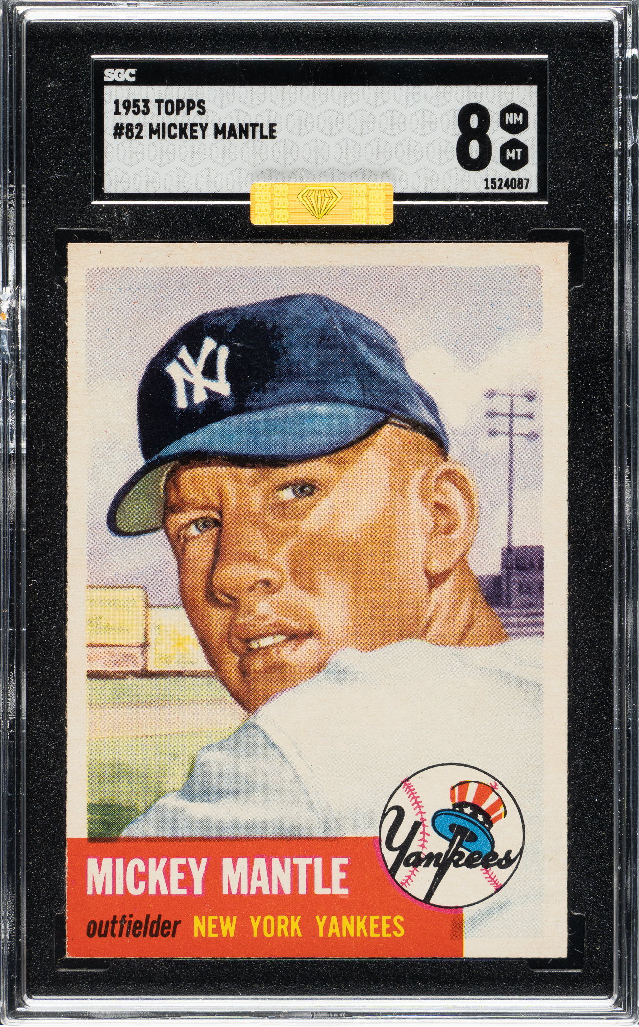 Graded NM/MT 8 by SGC. Extremely attractive high-grade example of New York Yankees Hall of Famer Mickey Mantle's second Topps card. One of card collecting's greatest classics, Mantle's second Topps card is the key to the 1953 Topps set and one of the most popular of all postwar baseball cards. This card has bold colors, a crisp image, and strong corners. Clean reverse. This is a fantastic high-grade example of one of collecting's most famous cards and would be a worthy cornerstone to either a high-grade 1950s Mantle card collection or any world-class collection of classic baseball cards. Awarded an MBA Gold Diamond by Mike Baker Authenticated for high-end eye appeal. A corresponding MBA sticker is affixed to the front of the holder.
