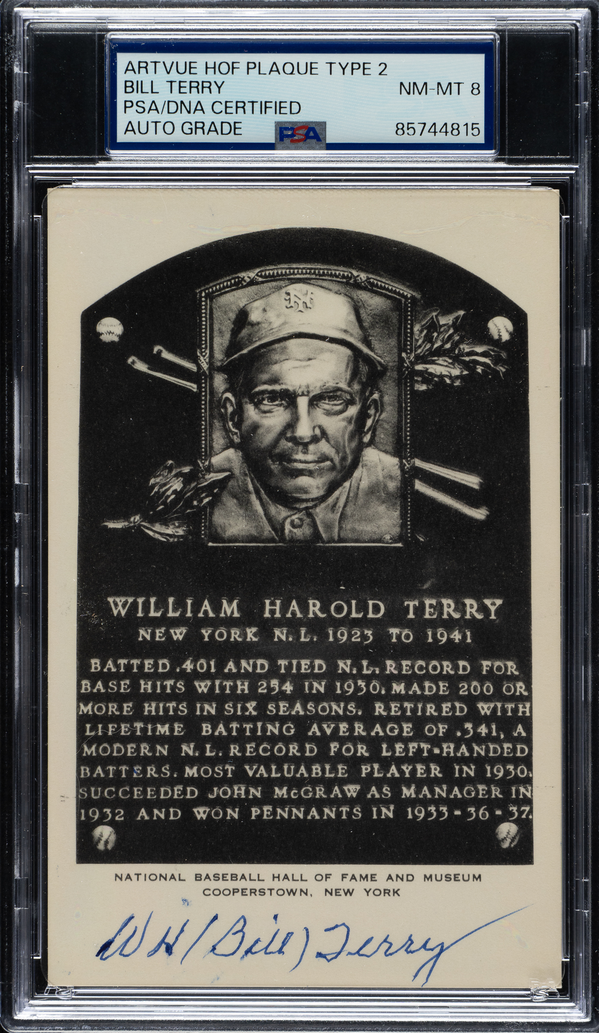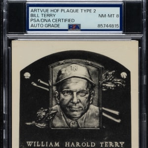 PSA/DNA has encapsulated the card, grading the signature NM-MT 8. New York Giants Hall of Famer Bill Terry.