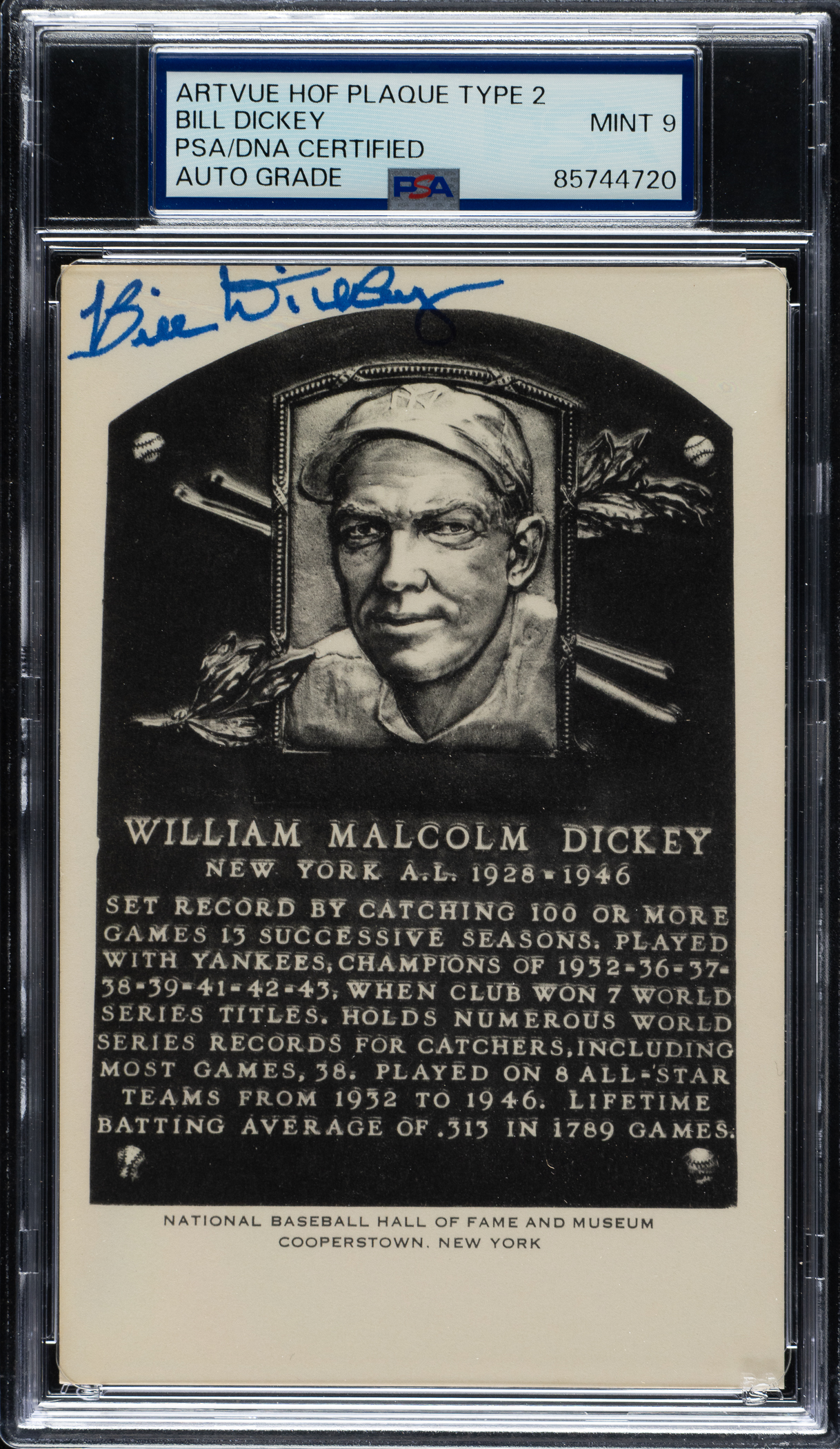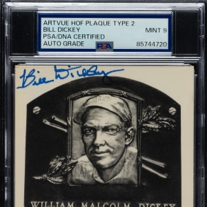 PSA/DNA has encapsulated the card, grading the signature MINT 9. New York Yankees Hall of Famer Bill Dickey.