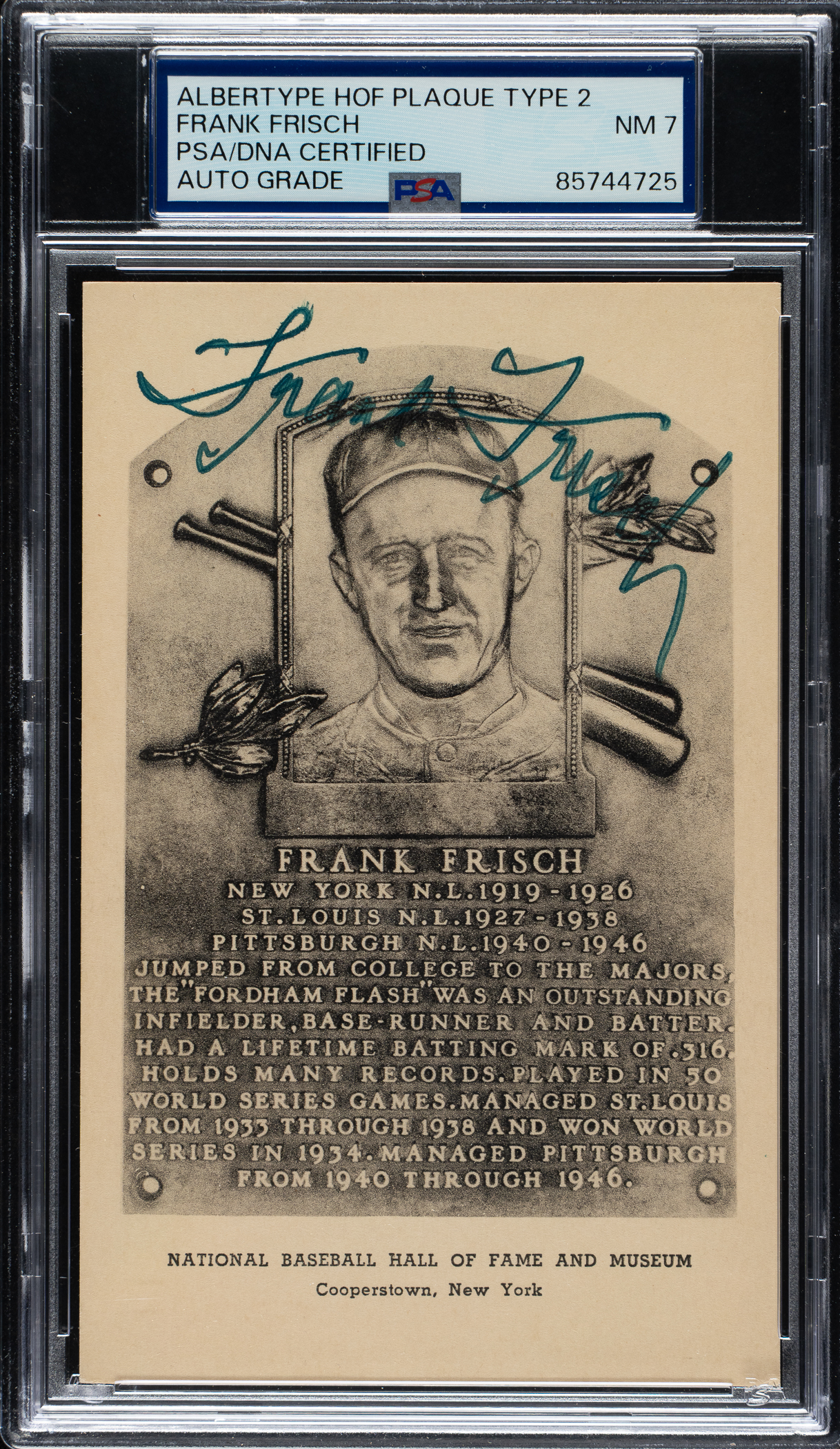 PSA/DNA has encapsulated the card, grading the signature NM 7. St. Louis Cardinals Hall of Famer Frank Frisch.