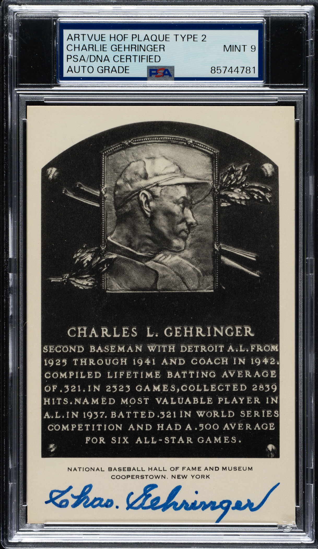 PSA/DNA has encapsulated the card, grading the signature MINT 9. Detroit Tigers Hall of Famer Charlie Gehringer.