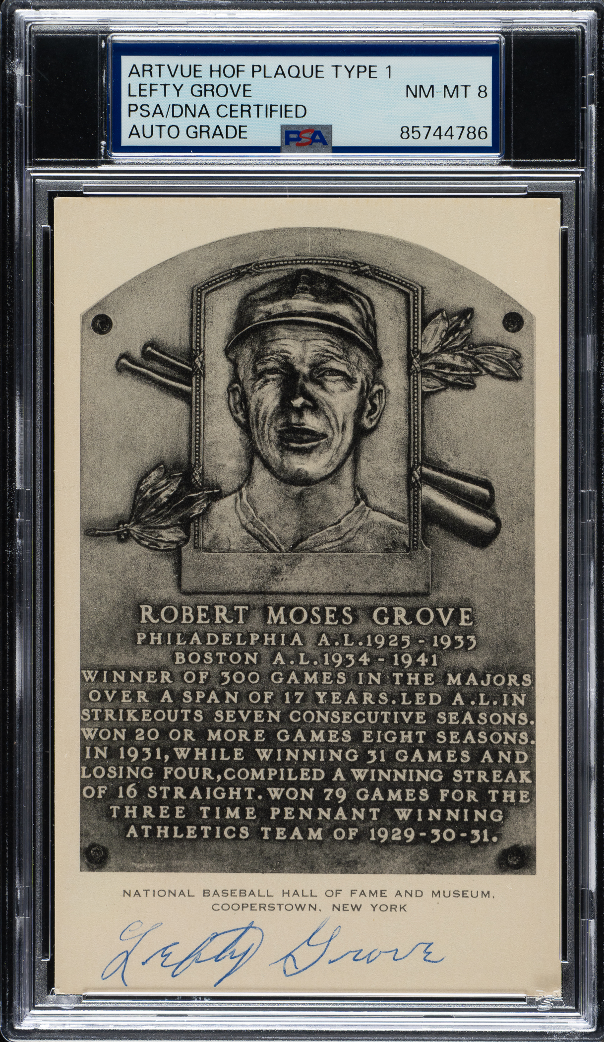 PSA/DNA has encapsulated the card, grading the signature NM-MT 8. Boston Red Sox Hall of Famer Lefty Grove.