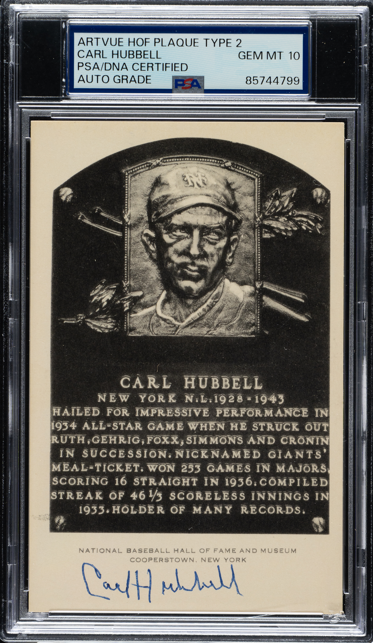 PSA/DNA has encapsulated the card, grading the signature GEM MINT 10. New York Giants Hall of Famer Carl Hubbell.