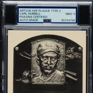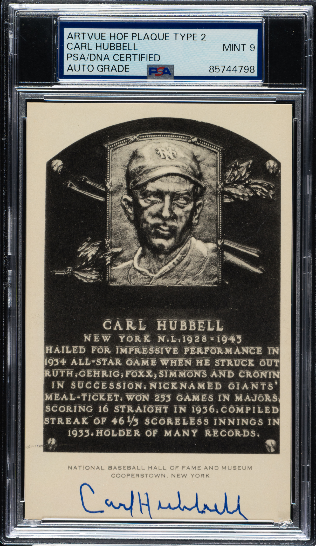 PSA/DNA has encapsulated the card, grading the signature MINT 9. New York Giants Hall of Famer Carl Hubbell.
