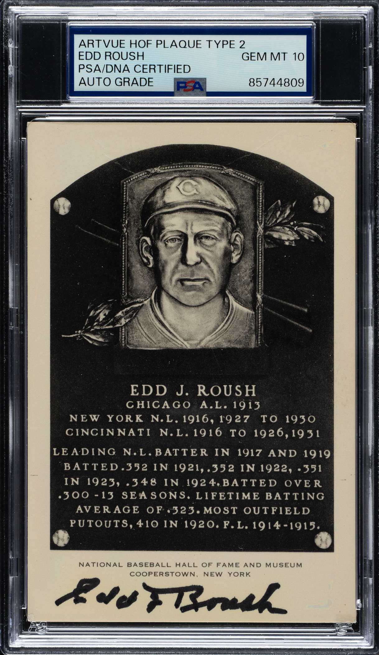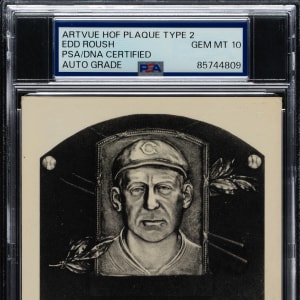 PSA/DNA has encapsulated the card, grading the signature GEM MINT 10. Cincinnati Reds Hall of Famer Edd Roush.