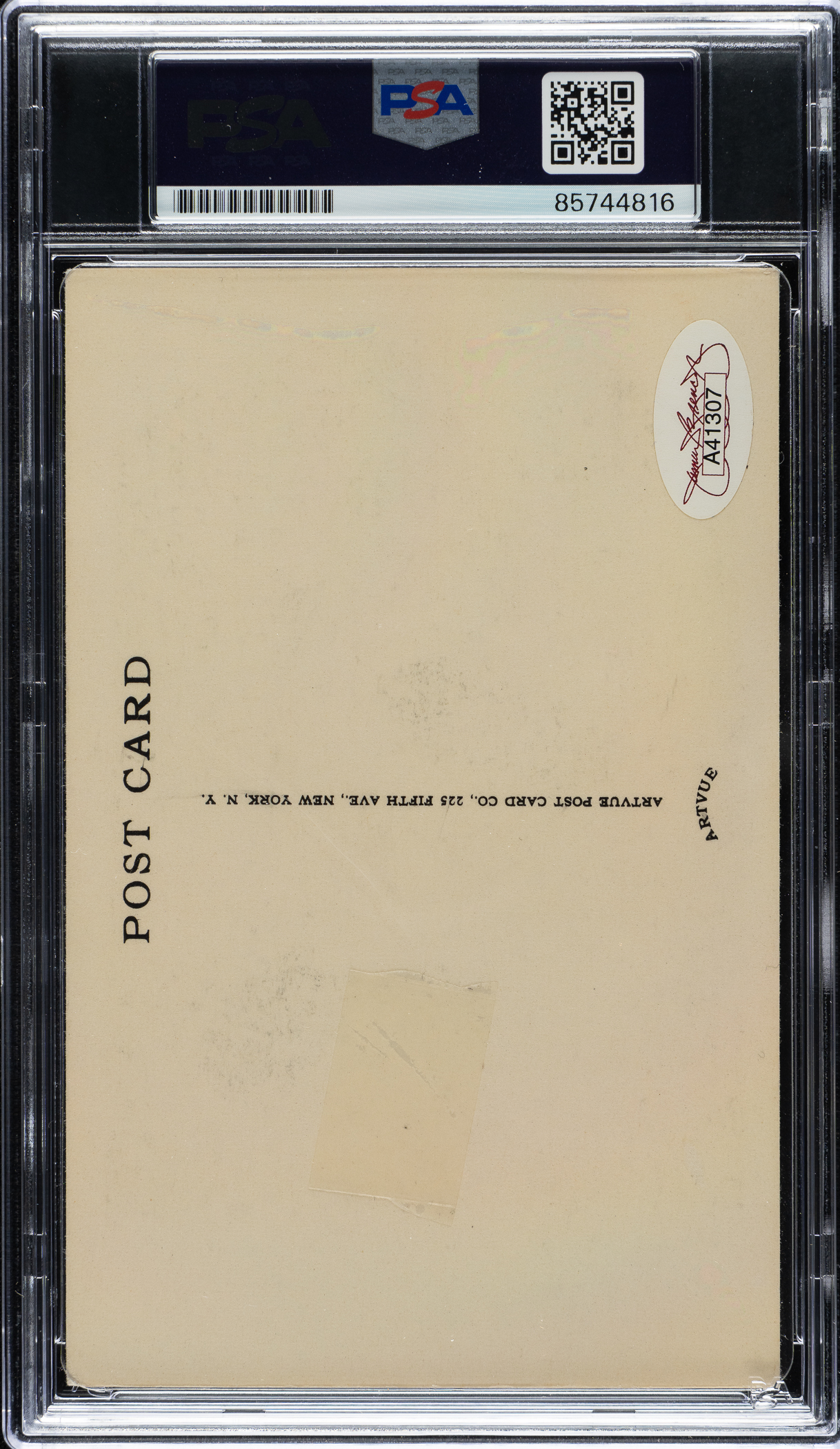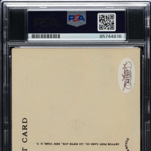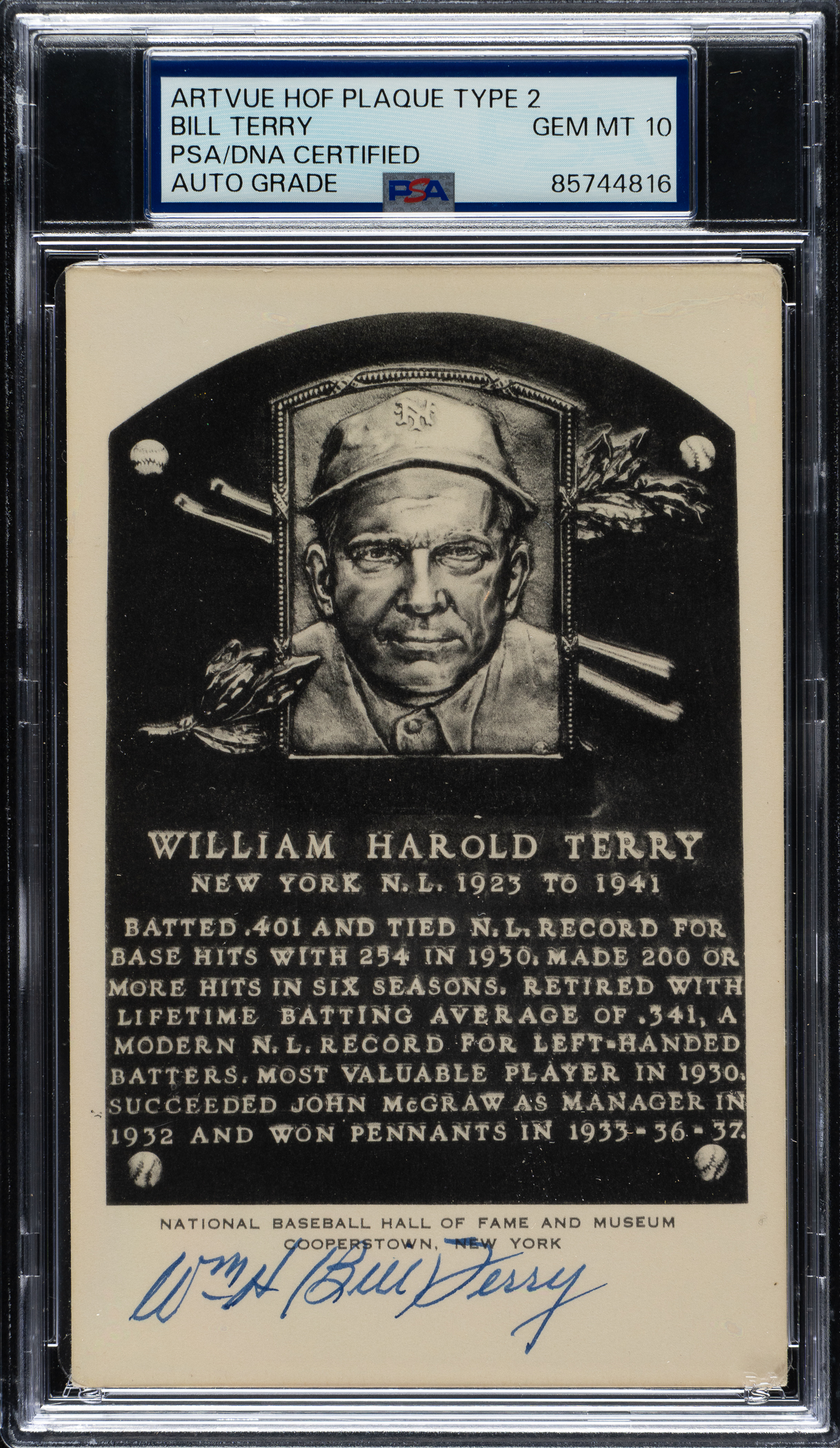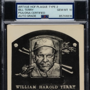 PSA/DNA has encapsulated the card, grading the signature GEM MINT 10. New York Giants Hall of Famer Bill Terry. James Spence/JSA certification sticker is affixed to the postcard.
