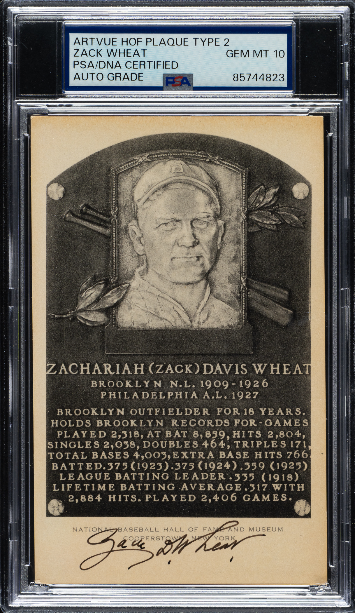 PSA/DNA has encapsulated the card, grading the signature GEM MINT 10. Brooklyn Dodgers Hall of Famer Zack Wheat.