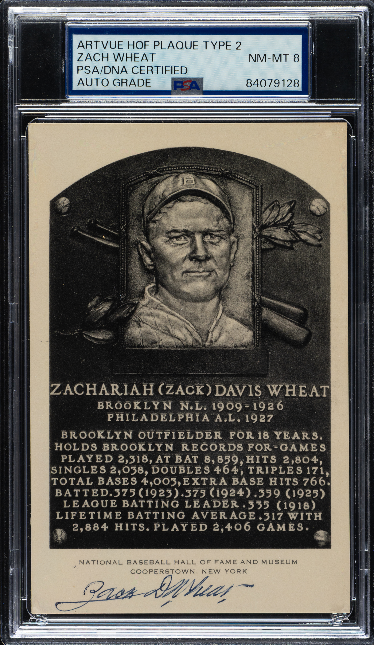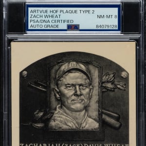 PSA/DNA has encapsulated the card, grading the signature NM-MT 8. Brooklyn Dodgers Hall of Famer Zack Wheat.