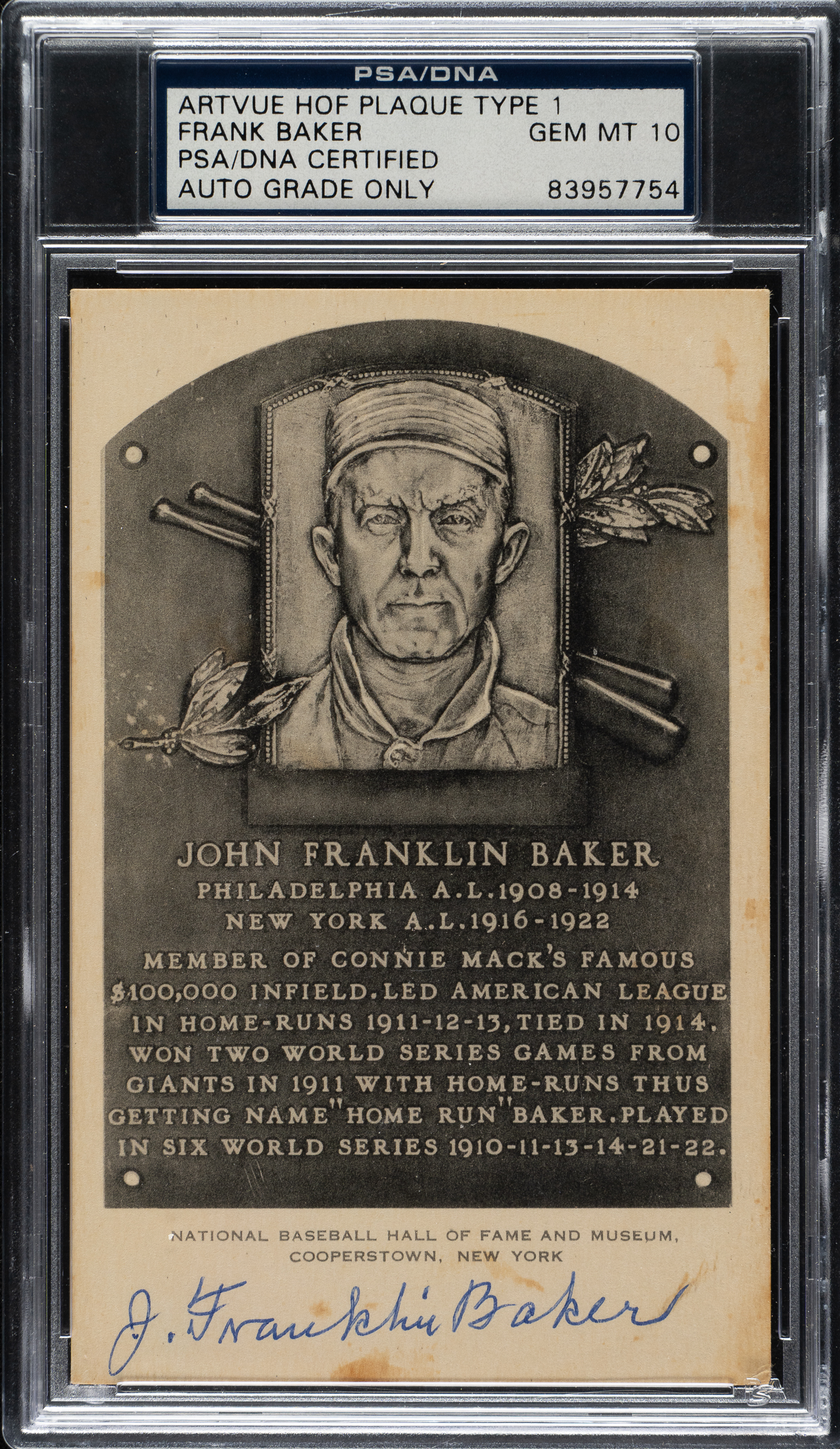 PSA/DNA has encapsulated the card, grading the signature GEM MINT 10. Philadelphia Athletics Hall of Famer Frank Baker.