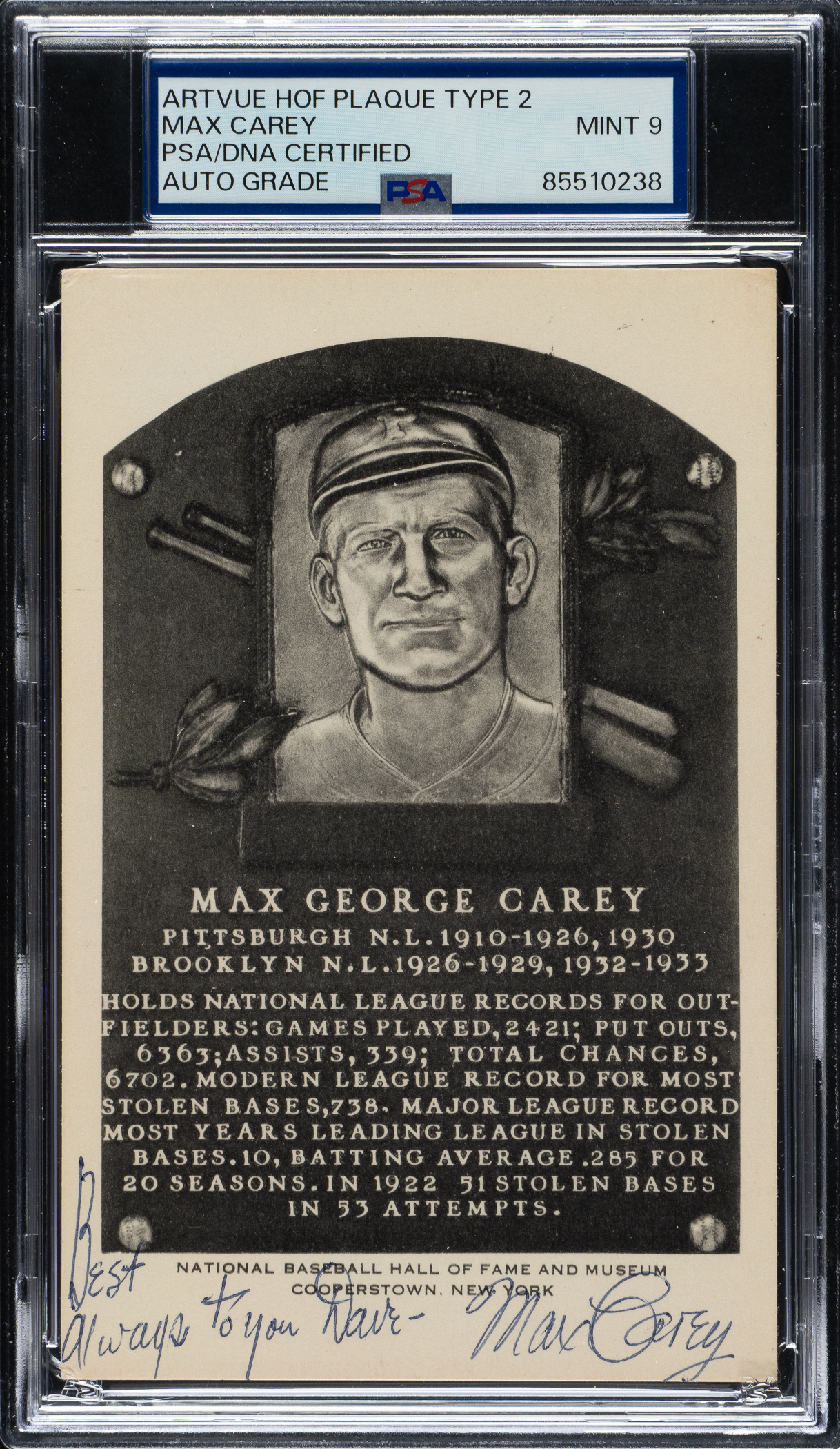 PSA/DNA has encapsulated the card, grading the signature MINT 9. Pittsburgh Pirates Hall of Famer Max Carey.