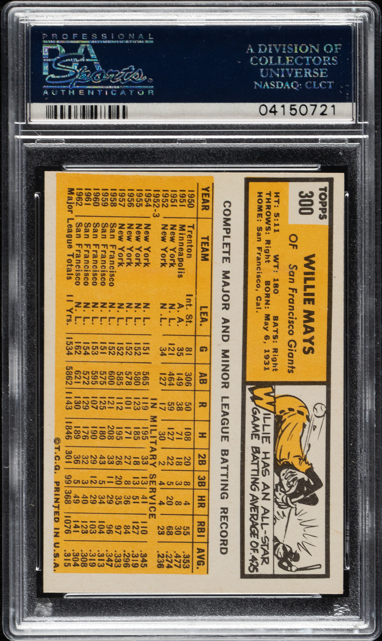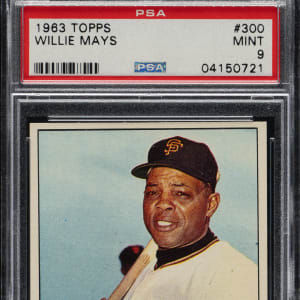 Graded MINT 9 by PSA. Out of an incredible 4,064 examples graded to date by PSA, only one example has ever graded GEM MINT 10. Extraordinary ultra-high-grade example of San Francisco Giants Hall of Famer Willie Mays from the 1963 Topps set. The card has vibrant colors, superb image quality, sharp corners, and virtually no wear on the bright yellow bottom border. Clean reverse. High-grade 1963 Topps examples are particularly hard to find as the flush-to-the-border design of this issue makes the cards very susceptible to corner and edge wear. This MINT card, as one might expect, has tremendous visual appeal. One of Mays' most popular cards, this is an extraordinary ultra-high-grade example worthy of any world-class 1963 Topps or Wille Mays collection.