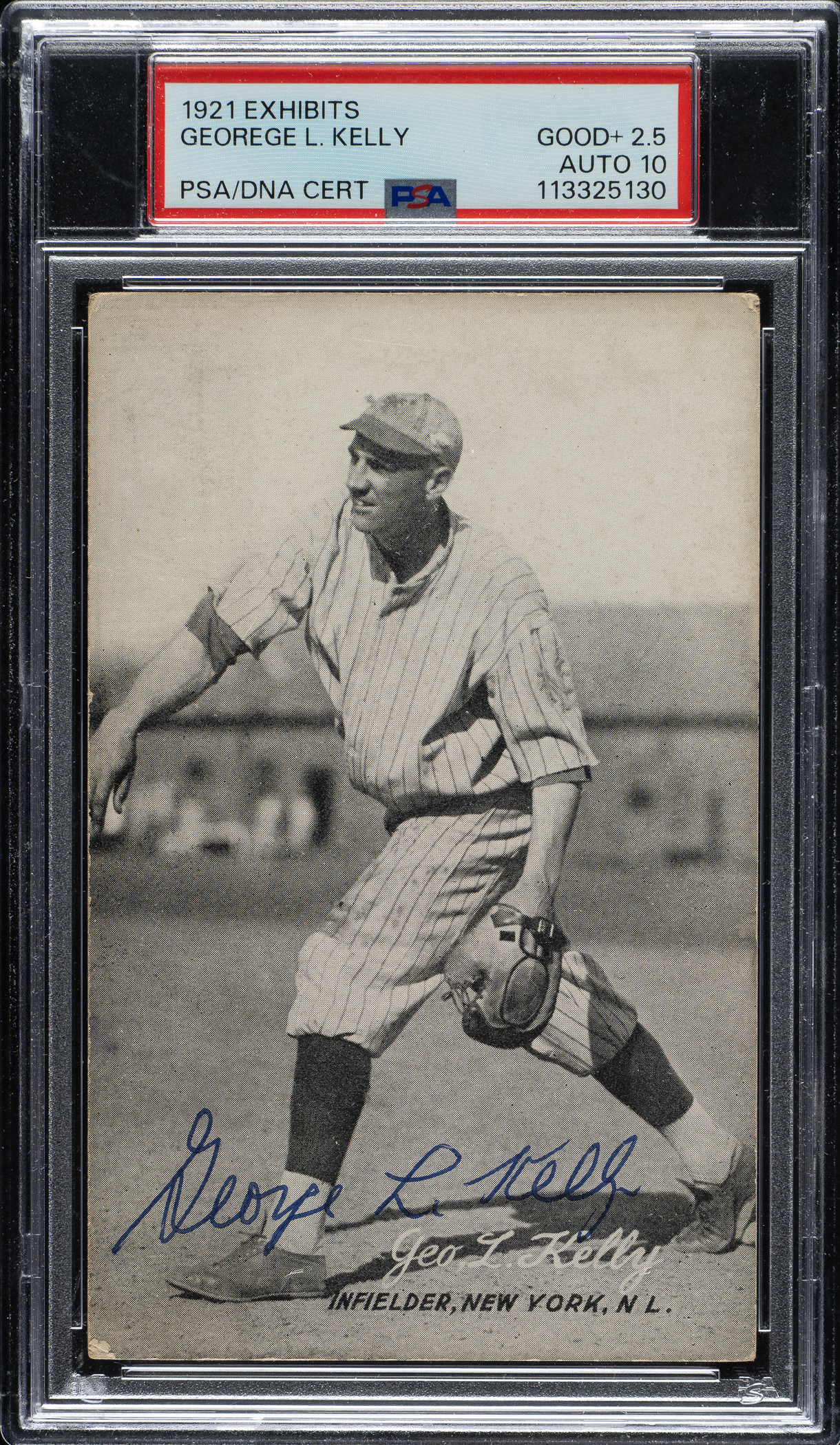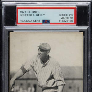 Signed example of New York Giants Hall of Famer George Kelly's 1921 Exhibits card. Signed "George L. Kelly" in blue ink along the base of the card. PSA has encapsulated the card, grading the card GOOD+ 2.5 and the signature GEM MINT 10. Kelly retired in 1932 but wasn't elected to the Hall of Fame until 1973, Since he died in 1984, Hall of Fame autograph collectors only had a brief 11-year window in which to acquire his signature. Vintage baseball cards signed by Kelly are rare, and this is one of only four signed 1921 Exhibit cards of Kelly listed in the PSA Population. Being one of Kelly's first appearances on a baseball card, this card is considered his rookie card by many collectors. The card (3.25 x 5.25 inches) has even corner wear and light soiling front and back.