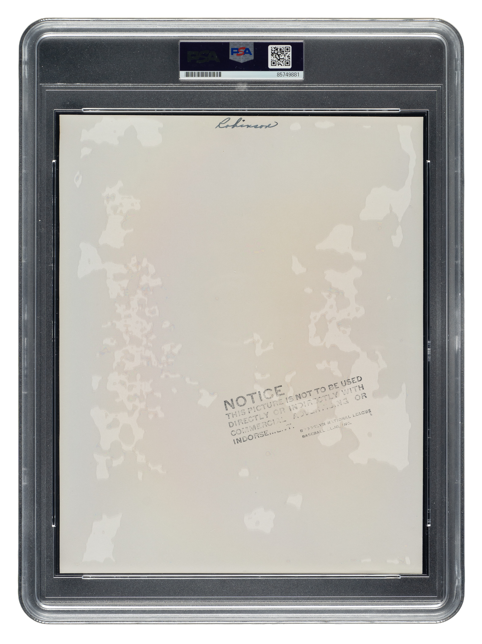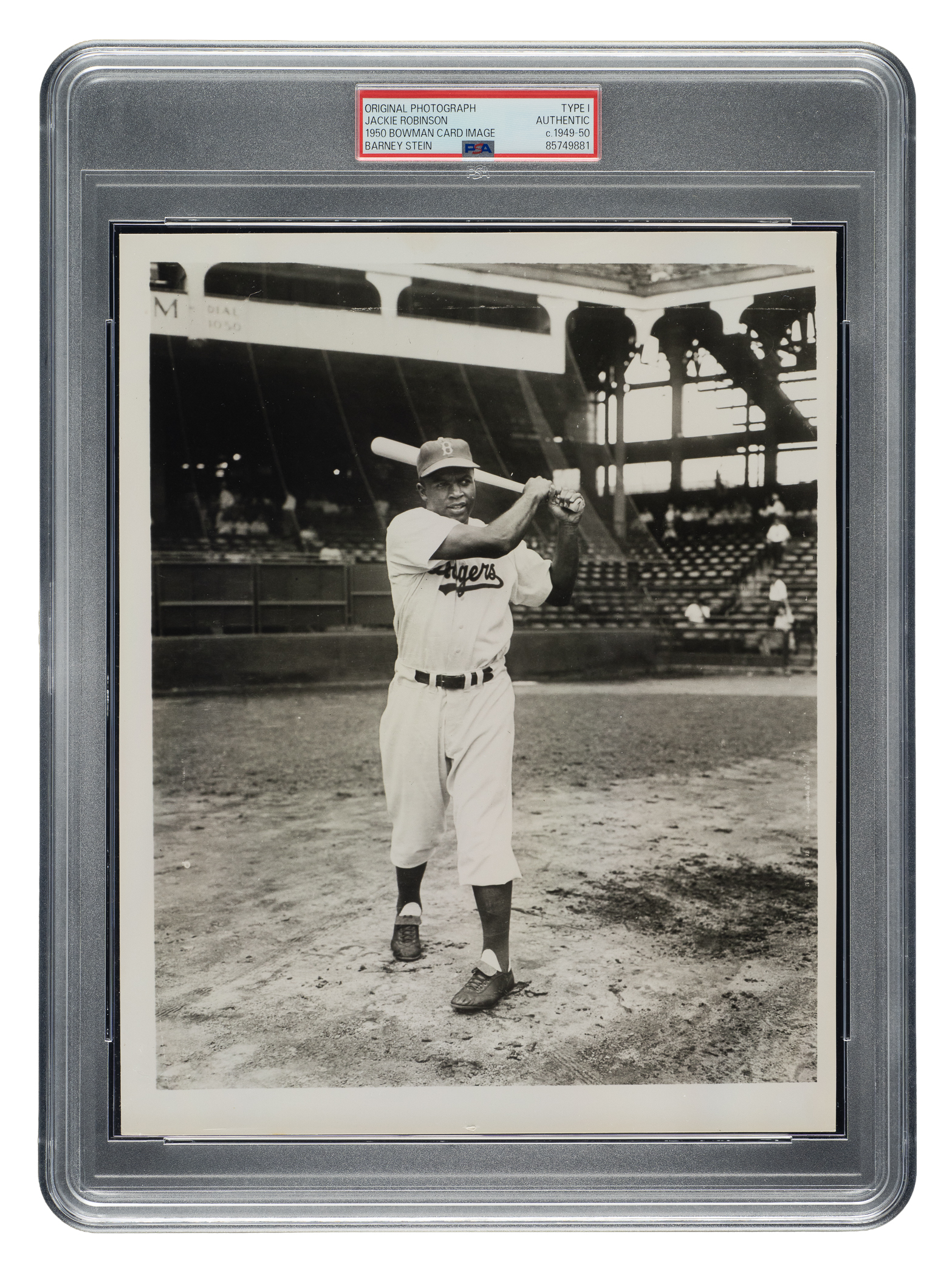 Original photo of Jackie Robinson, taken by noted sports photographer Barney Stein, used in the production of Robinson's 1950 Bowman card. Encapsulated and certified as an original Type I photograph by PSA/DNA. A credit stamp on the reverse reads "Notice - This picture is not to be used directly or indirectly with commercial advertising or indorsement [sic]. Brooklyn National League Baseball Club, Inc." Robinson's last name, written in blue ink, also appears on the reverse. Barney Stein, who worked for the New York Post from 1939 to 1970, was also the official photographer of the Brooklyn Dodgers for over twenty years. Photos used in the production of trading cards, especially those featuring prominent Hall of Famers such as Robinson, have become increasingly popular in recent years. This is one of only a small number of vintage photos we have seen featuring a player image used in the 1950 Bowman set. The photo (8 x 10 inches) display a slight surface wrinkle in the lower left border and is otherwise in Near Mint condition. This is an iconic image of Robinson and one that should appeal equally to photo, Brooklyn Dodgers, and baseball-card collectors.