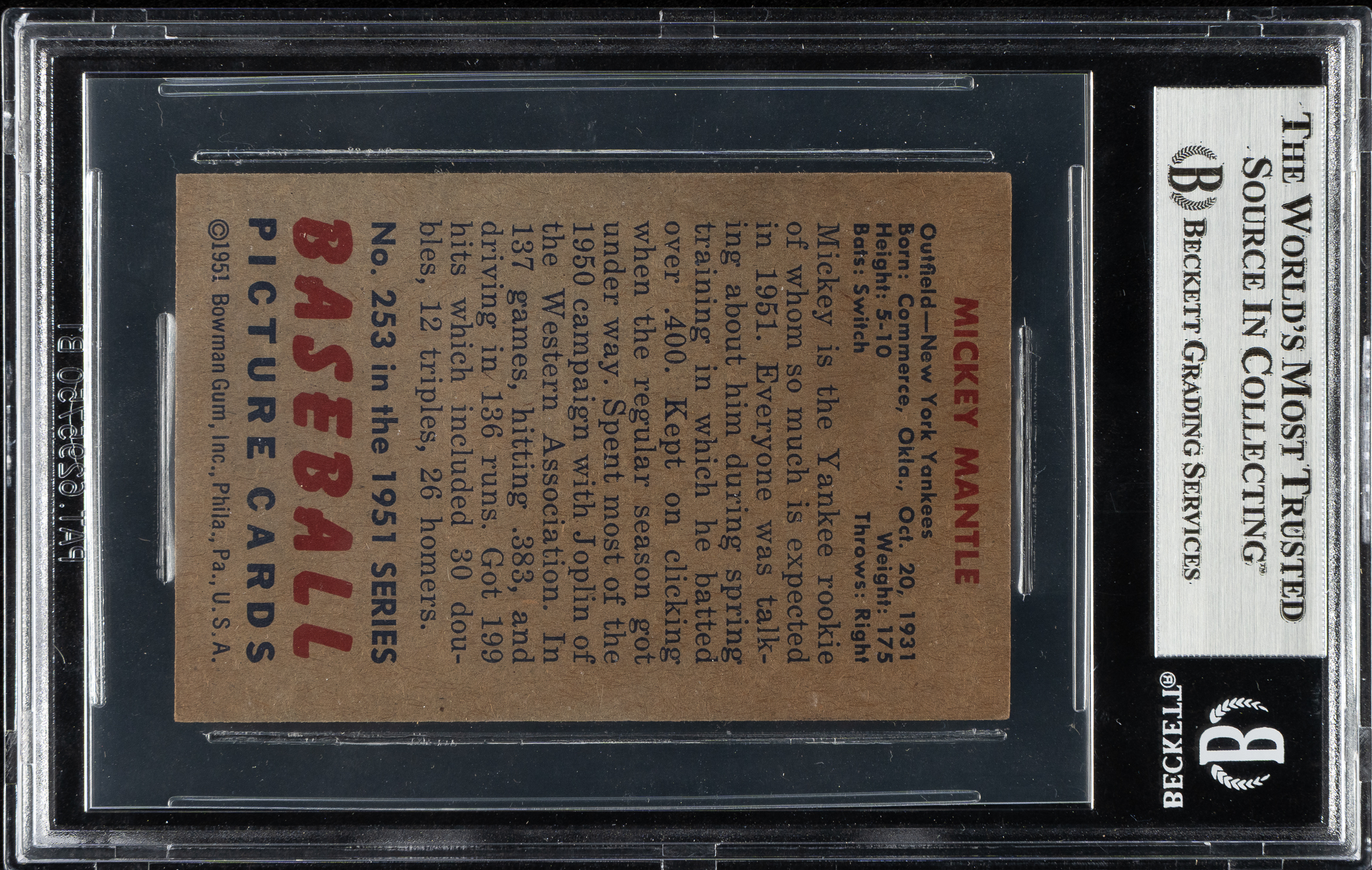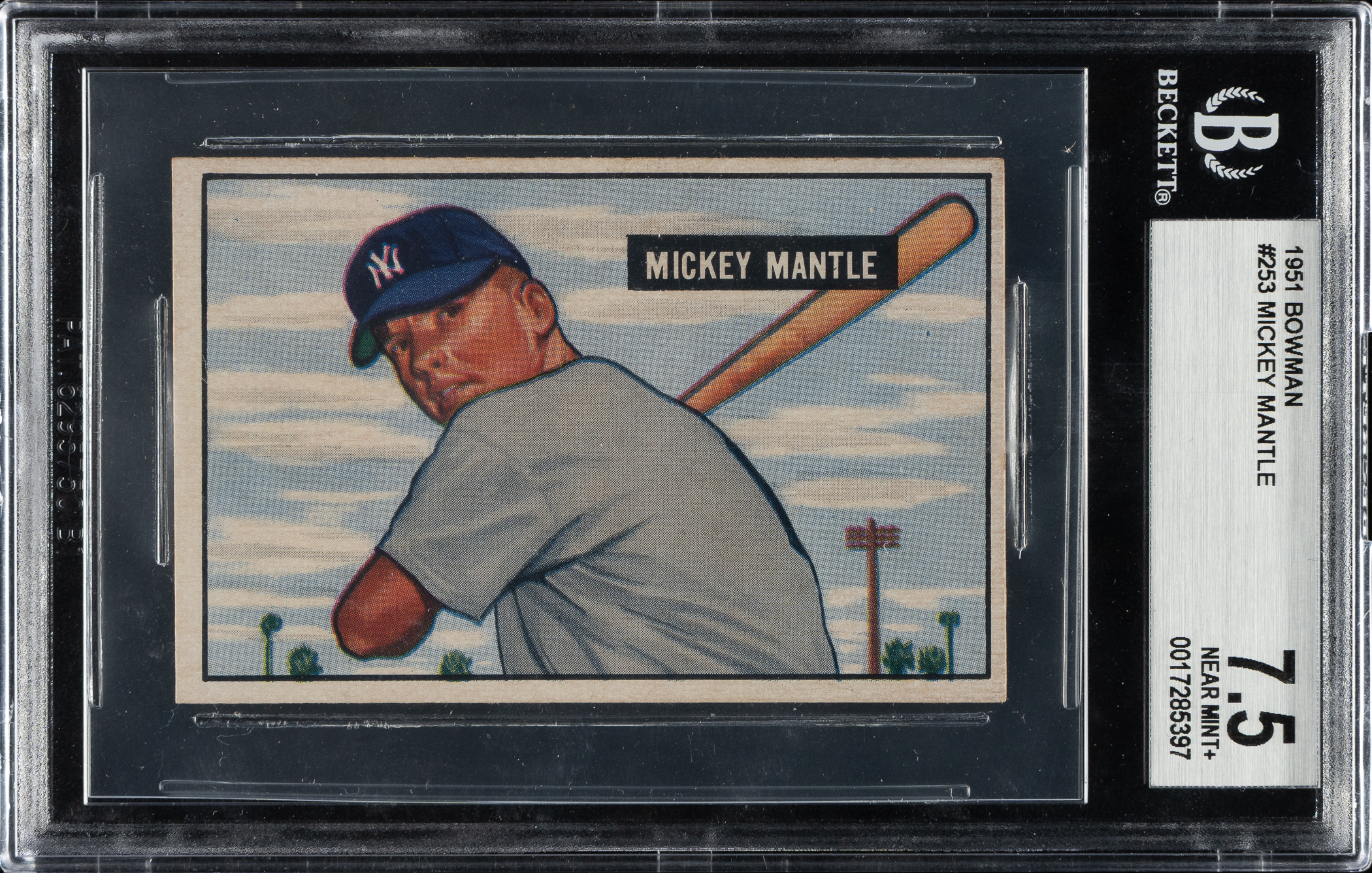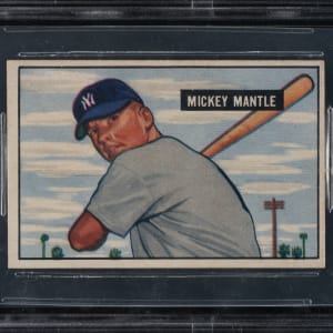 Graded NM+ 7.5 by BGS. Outstanding high-grade example of Mickey Mantle's true rookie card. One of card collecting's classics, Mantle's rookie card is the key to the 1951 Bowman set and one of the most popular and significant of all postwar baseball cards. The offered card has vibrant colors, outstanding registration, and four strong corners. It is free of the common print lines that often plague examples of this card. Clean reverse. This 1951 Bowman Mickey Mantle presents a particularly significant collecting and investing opportunity as it is such a strong and attractive example that rarely is offered in this grade! This is a fantastic high-grade example of one of collecting's most famous cards that would be a worthy cornerstone to either a high-grade 1950s Mantle card collection or a world-class collection of classic baseball cards.