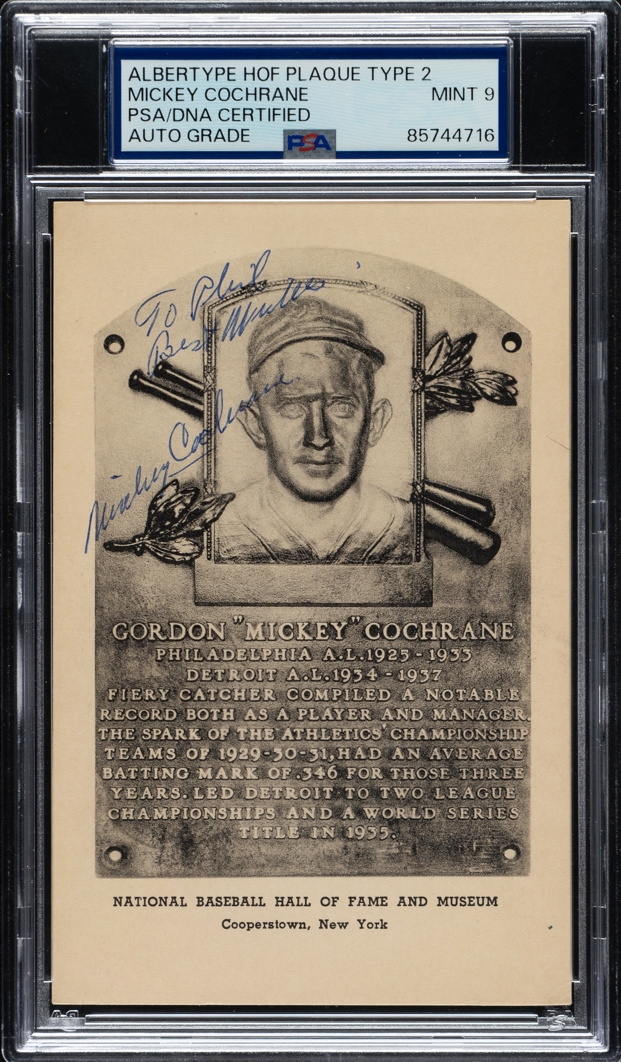 PSA/DNA has encapsulated the postcard, grading the signature MINT 9. Philadelphia Athletics Hall of Famer Mickey Cochrane.