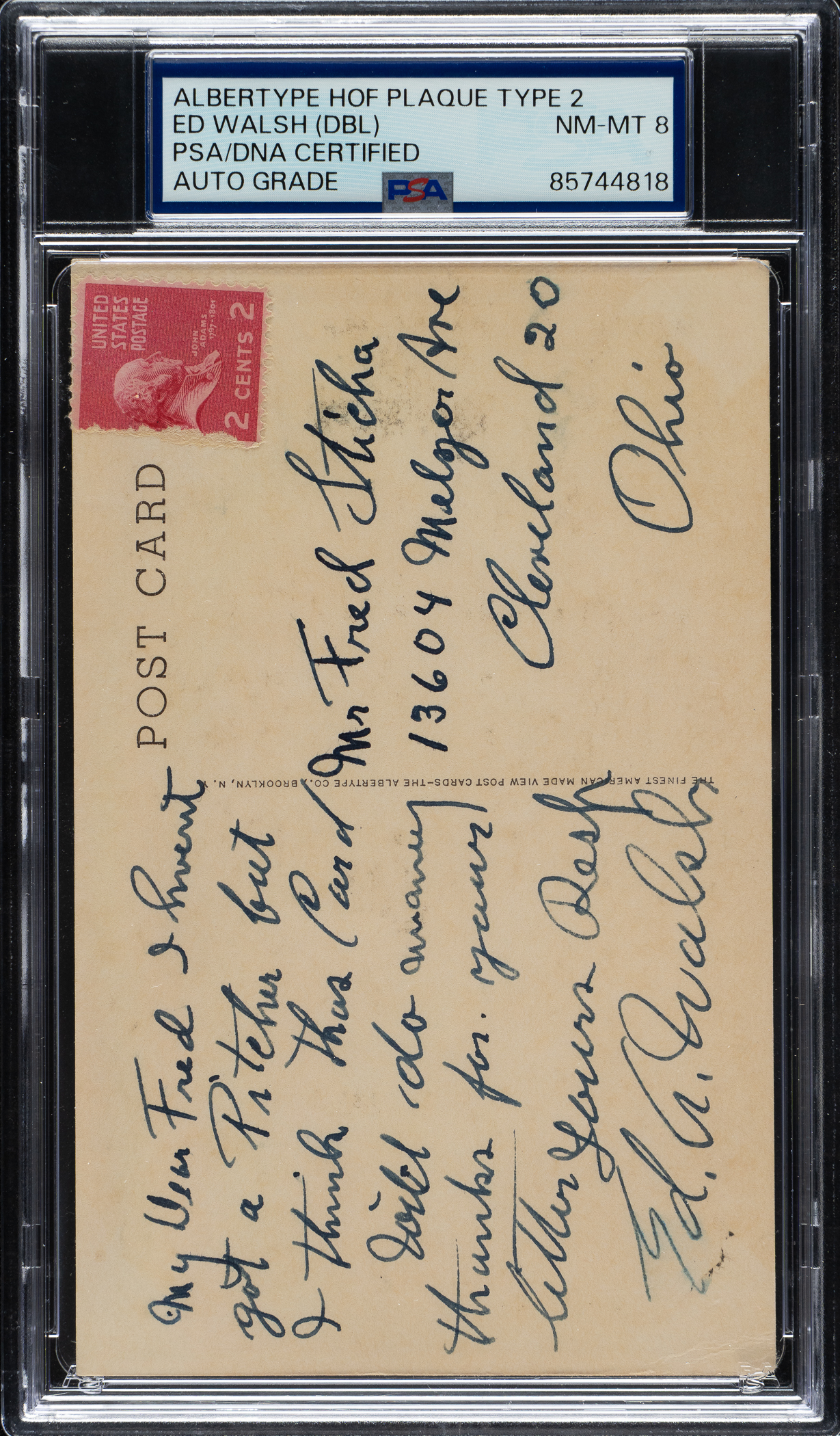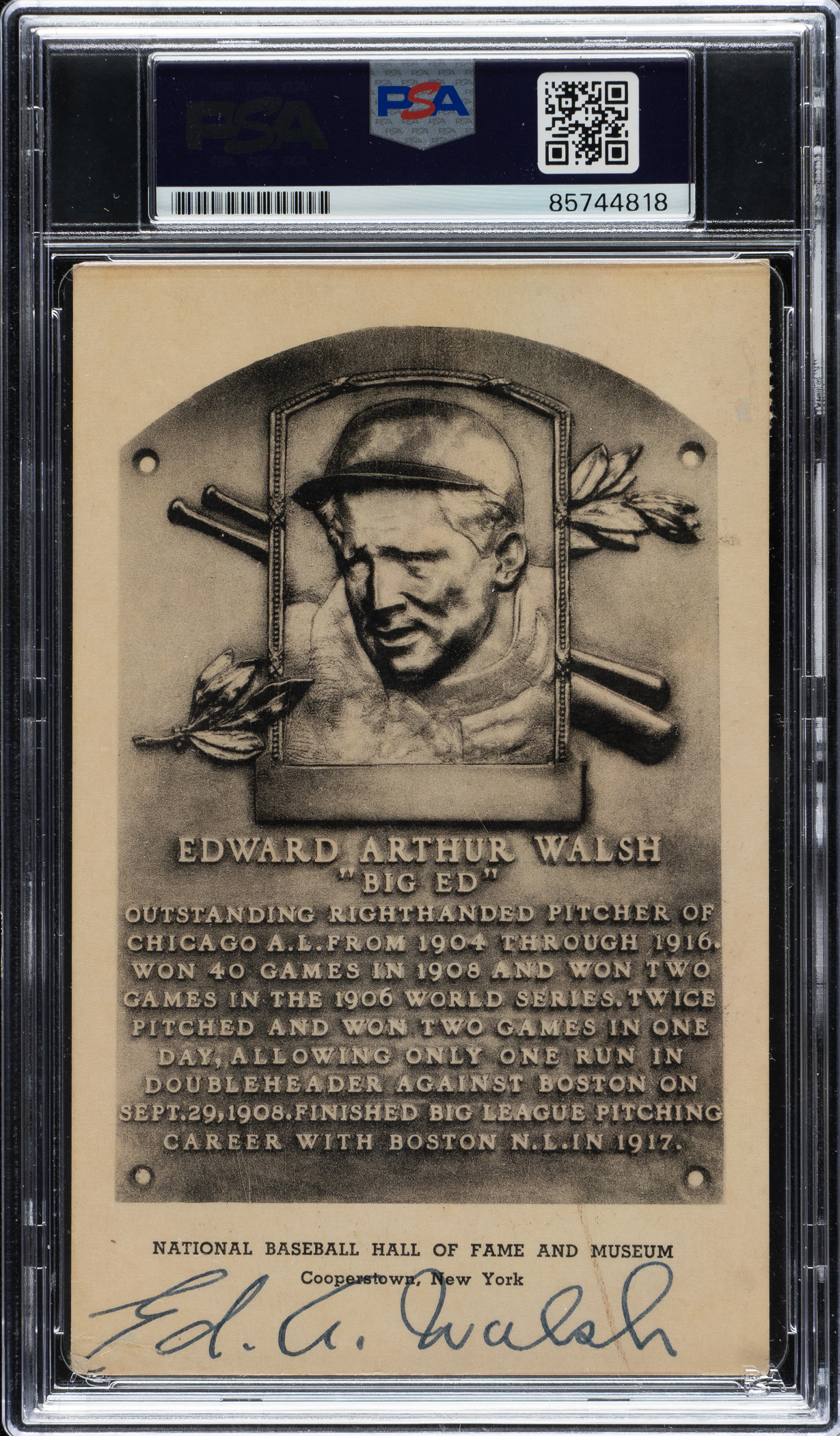 PSA/DNA has encapsulated the postcard, grading the signature NM-MT 8. Chicago White Sox Hall of Famer Ed Walsh.