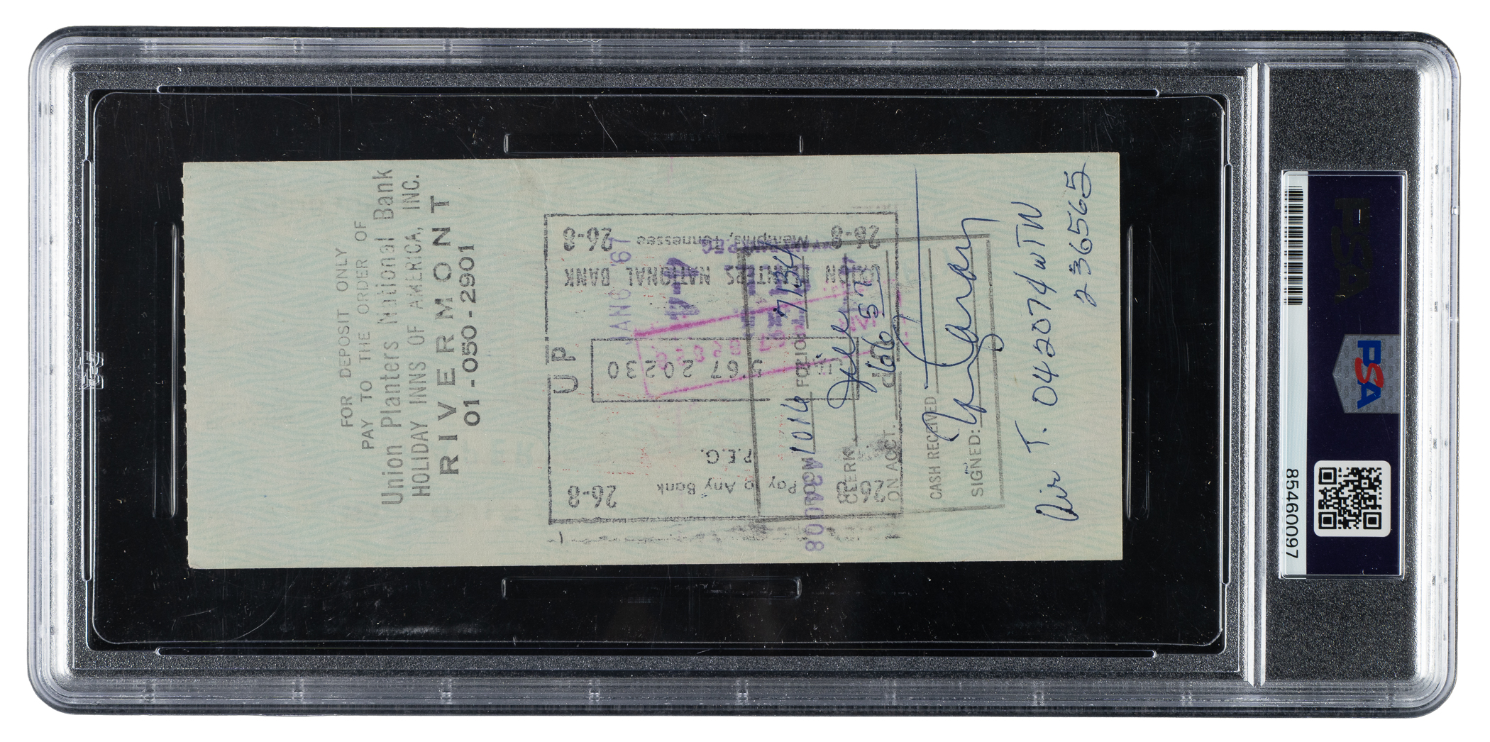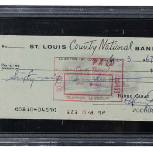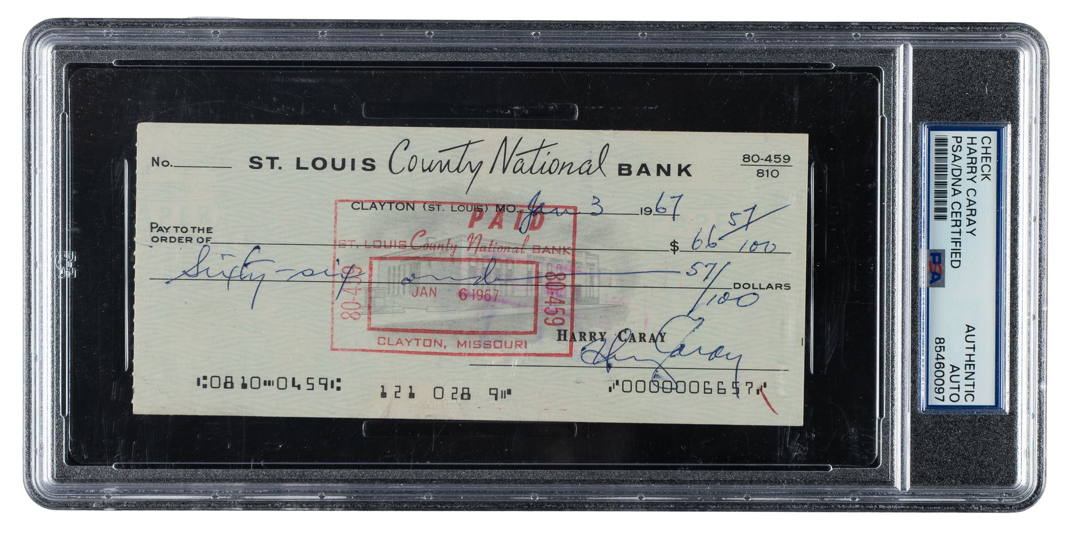 PSA/DNA has encapsulated the check, grading the signatures Authentic. Hall of Famer Harry Caray.